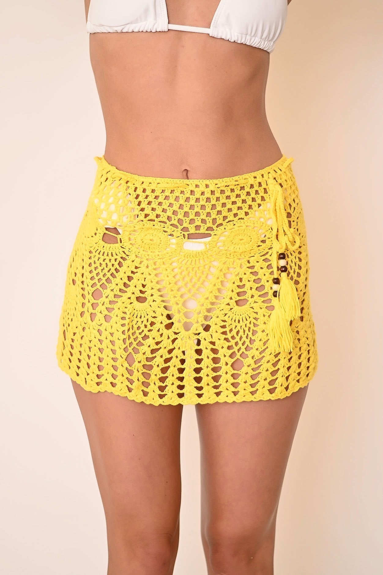Hit the beach in style with our handcrafted Beach Skirt Coverup, in lively pink, bright yellow, or classic white. With its crochet-knit craftsmanship, detailed patterns, and adjustable tassel tie, this piece marries bohemian chic with coastal comfort, making it a summer essential.