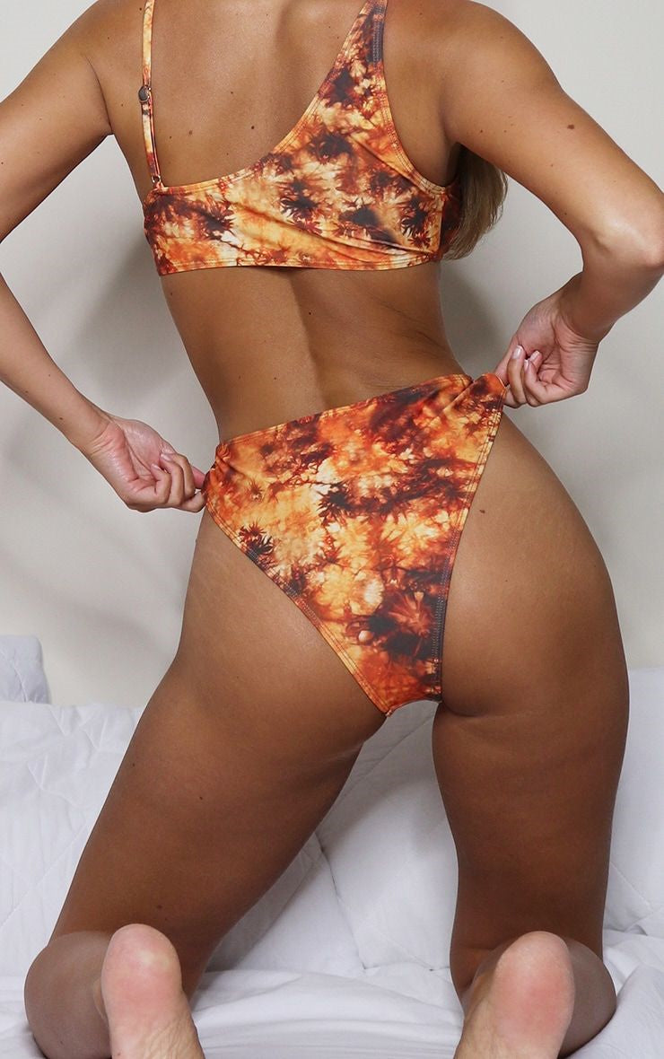 Show off your summer tan in this beautiful bikini. This two-piece bikini is full of colorful patterns with a cut-out design on the top and bottom. A fun bikini that is perfect for any summer vacation.