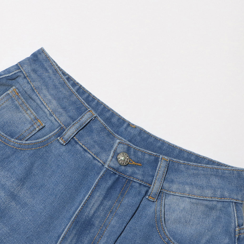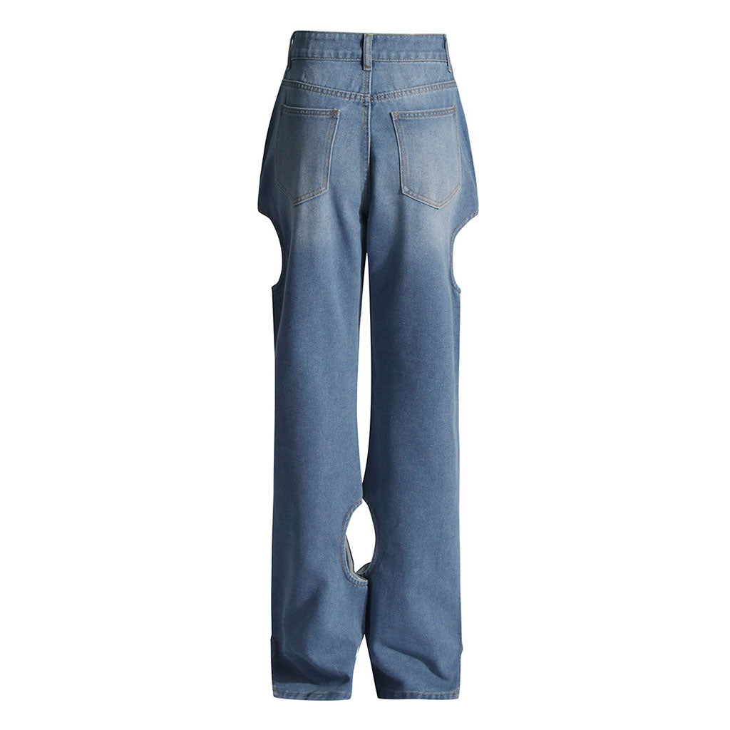 Asymmetric Cut Out Whisker Leg Washed Denim Jeans