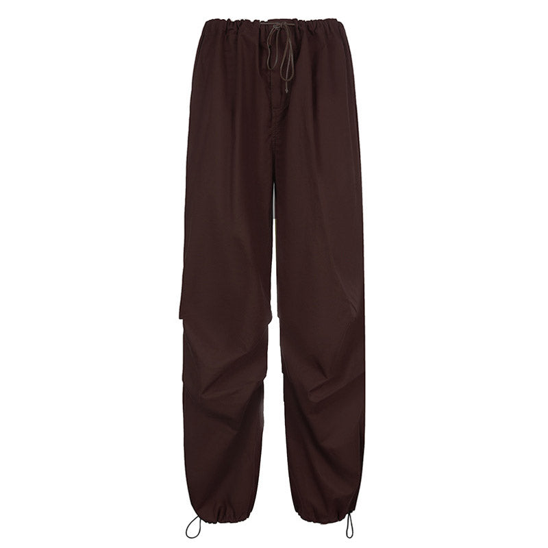 Casual Low Waist Drawstring Ruched Trim Baggy Cargo Pants - Brown