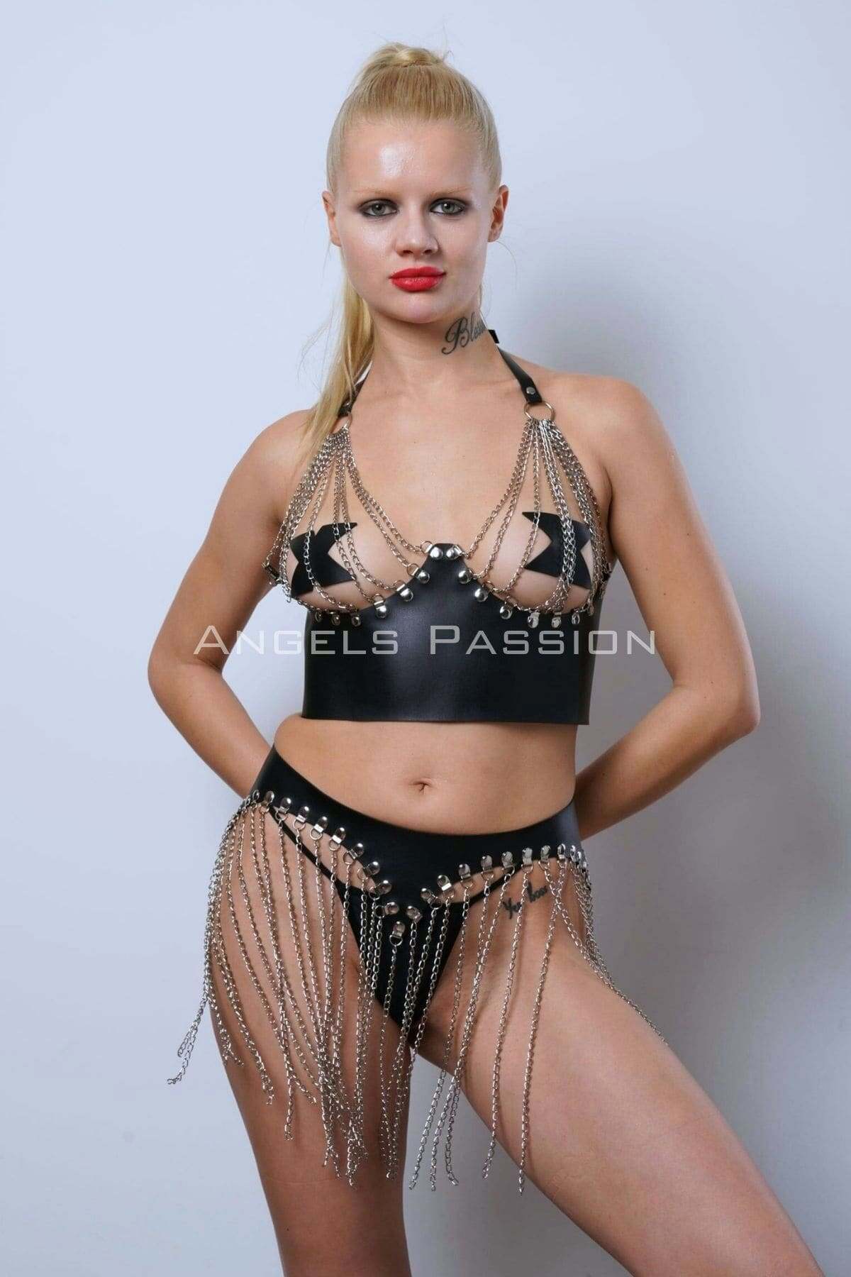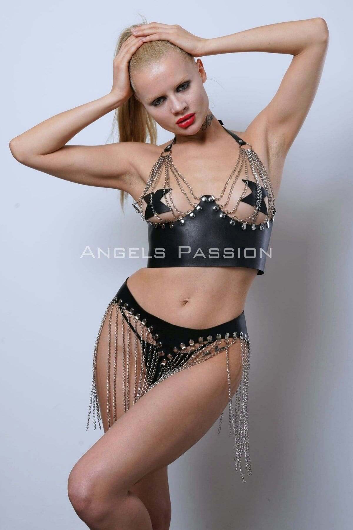 Chain Bustier Skirt Set, Stylish Leather Skirt and Bustier