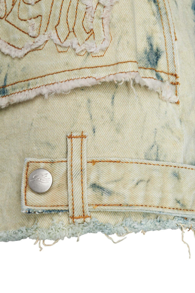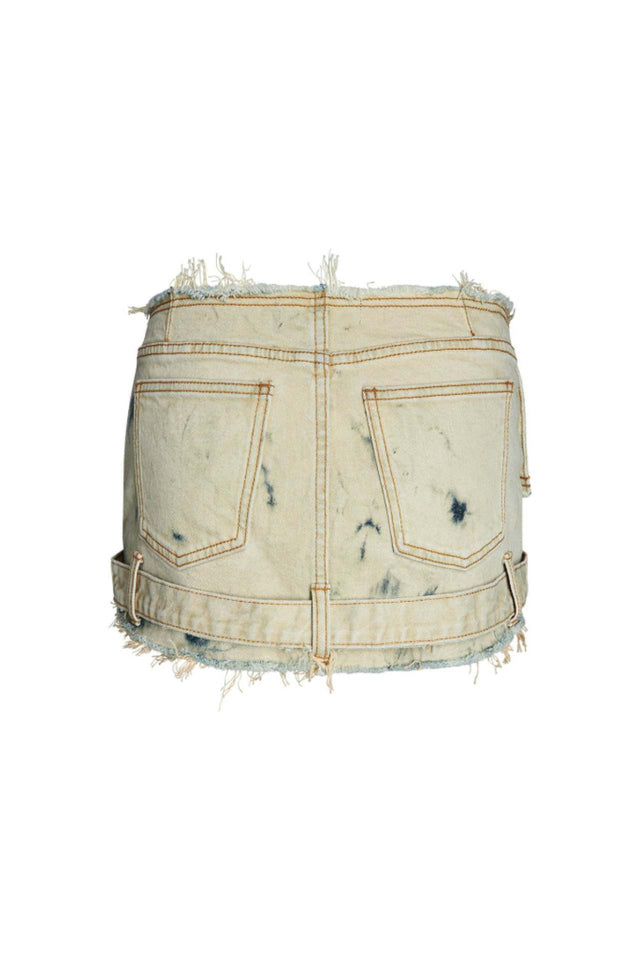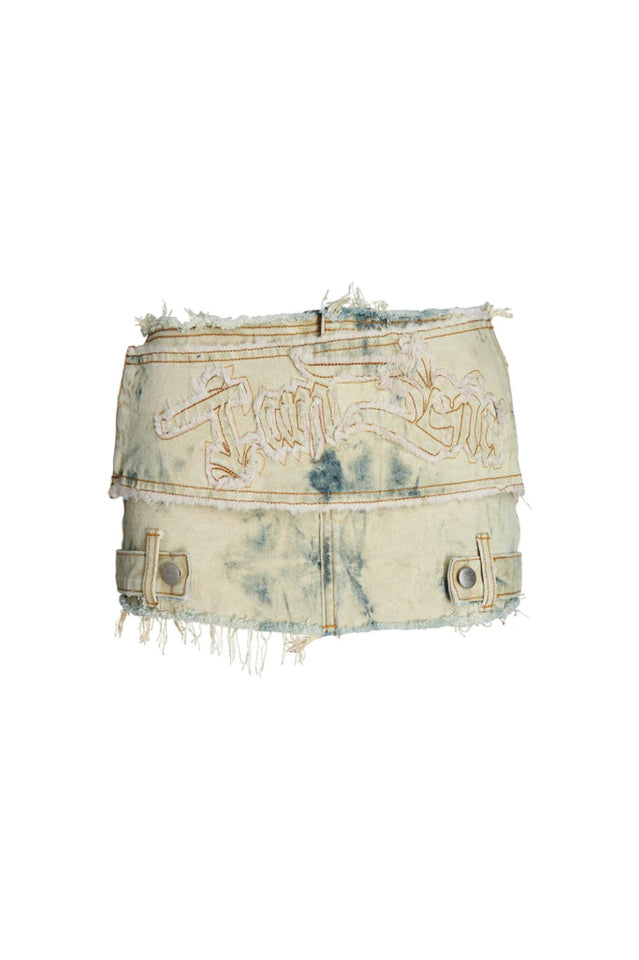 Neutral denim micro mini skirt with custom hand tie dyed indigo detail
