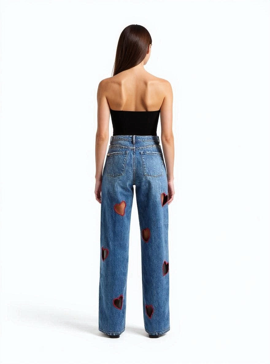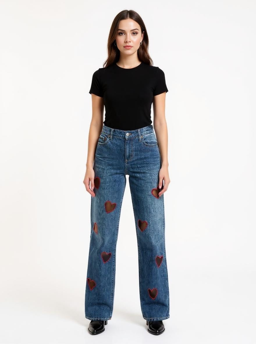 These high-waist jeans bring a fun twist to your wardrobe with charming heart details that add a playful touch. Designed to flatter your silhouette, they combine comfort and style effortlessly, making them perfect for casual days or standout looks. Embrace a little love in your denim!