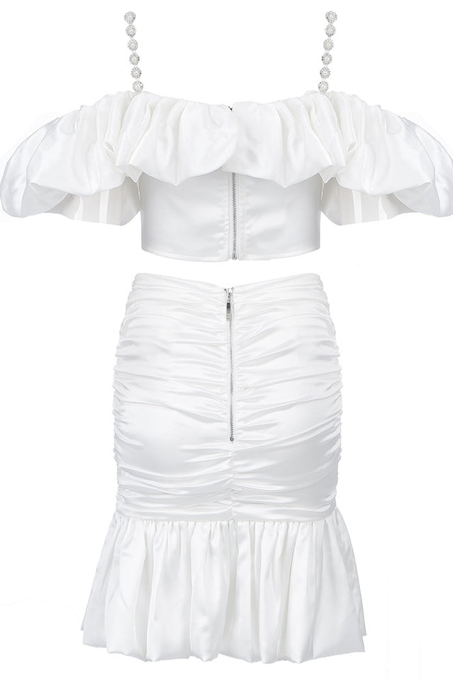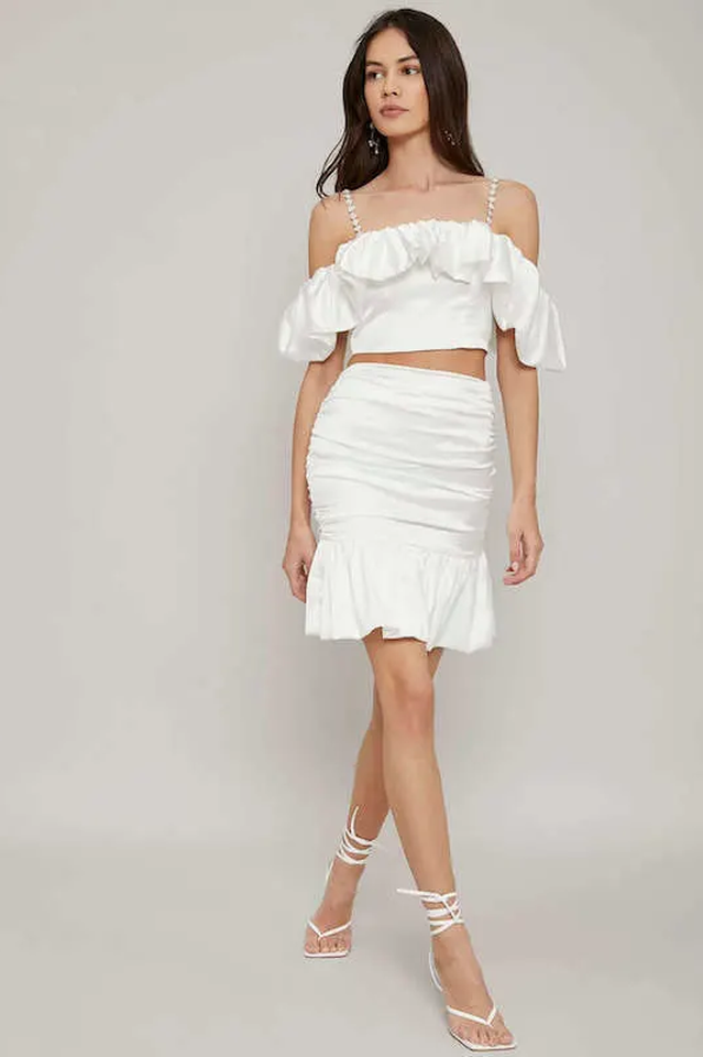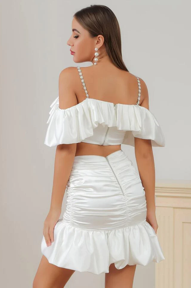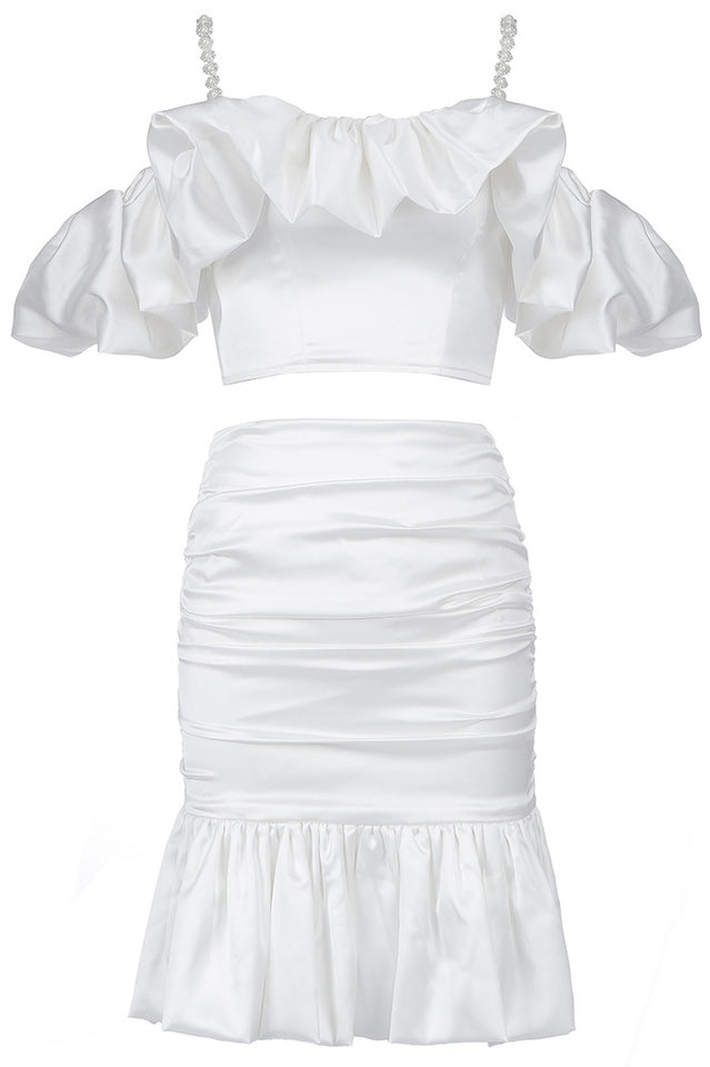 If you want to feel sexy and attractive, this Lucra Crop Satin Top & Mermaid Skirt Set in White is perfect for you. Its waist-in design beautifully accentuates your figure, making you look stunning and confident. The off-shoulder design adds a touch of elegance, making you stand out in any crowd. The white color gives you a composed and sophisticated look.