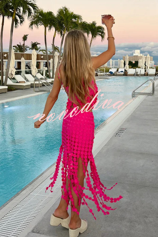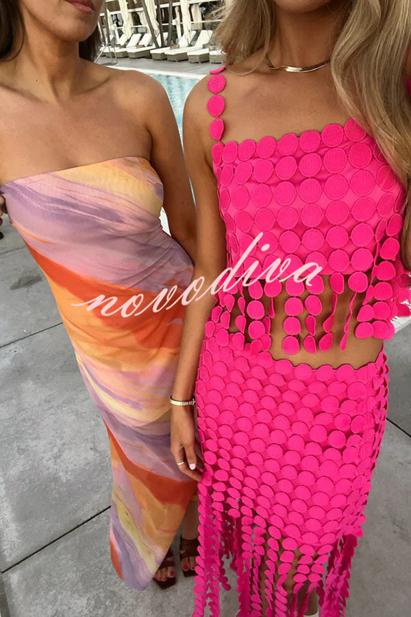 Unleash your bold side with the Riviera Rhythm Skirt, a daring yet playful maxi made to turn heads at any summer party or beachfront escape. Featuring striking circle embroidery and free-flowing tassel fringes, this skirt dances with every step, adding movement, rhythm, and standout texture to your look.