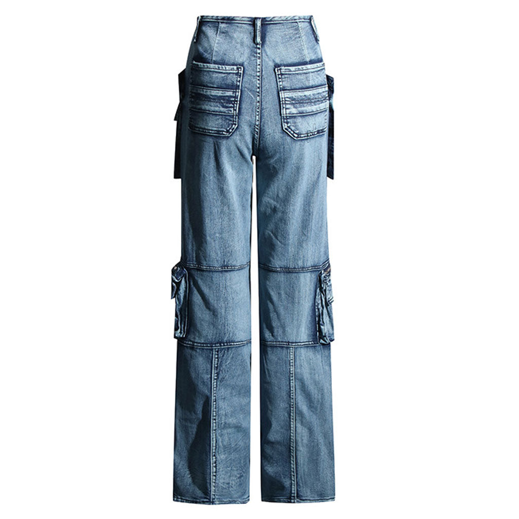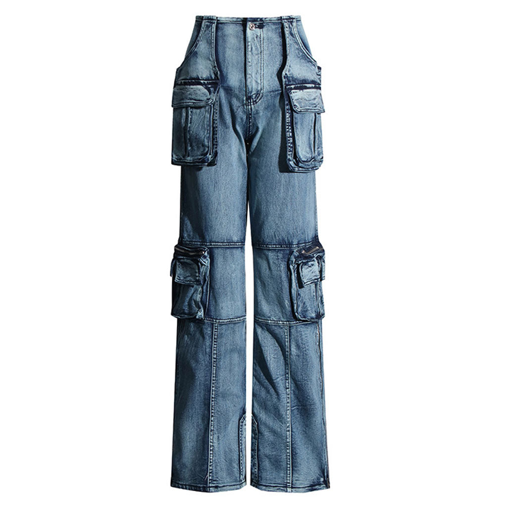 Street Distressed Flap Pocket Zipper Split Hem Straight Leg Cargo Jeans