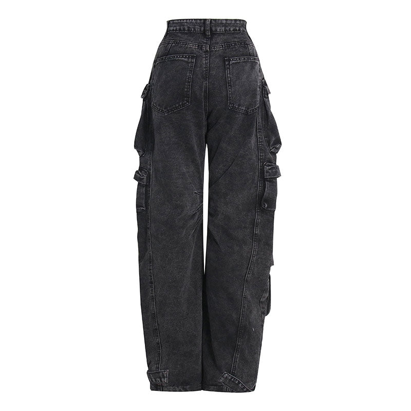 Street Style Panel Trim Patch Pocket Oversized Cargo Jeans - Gray