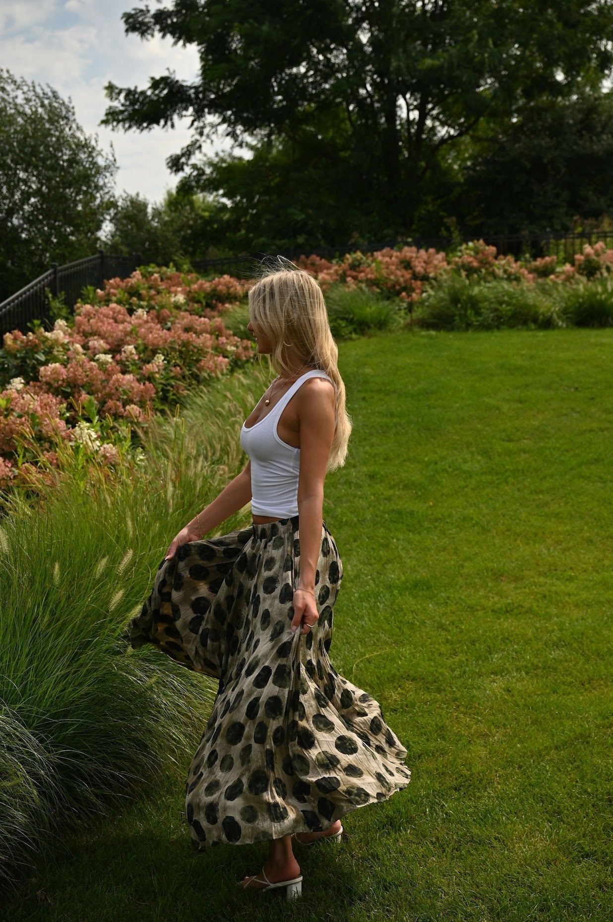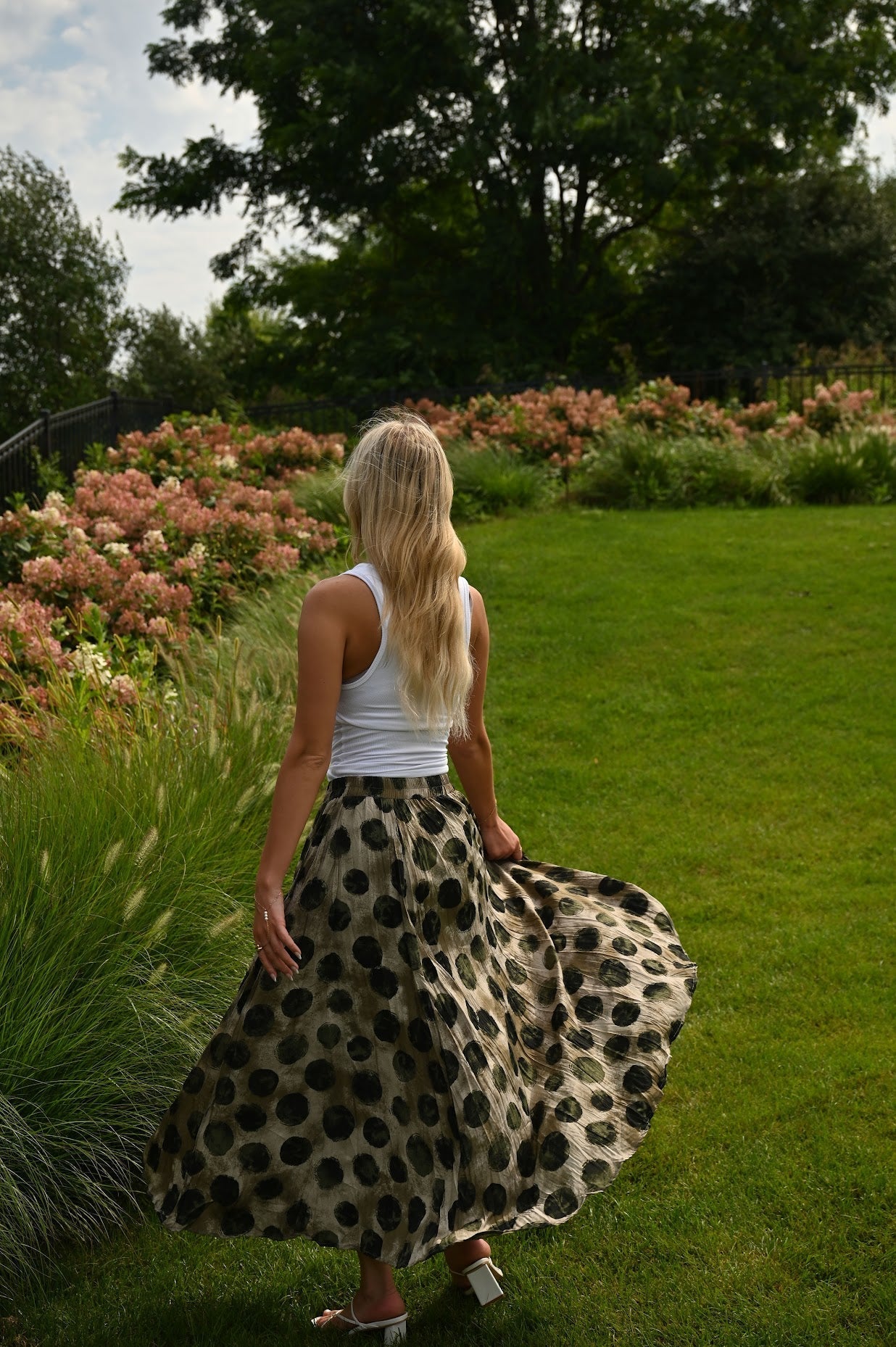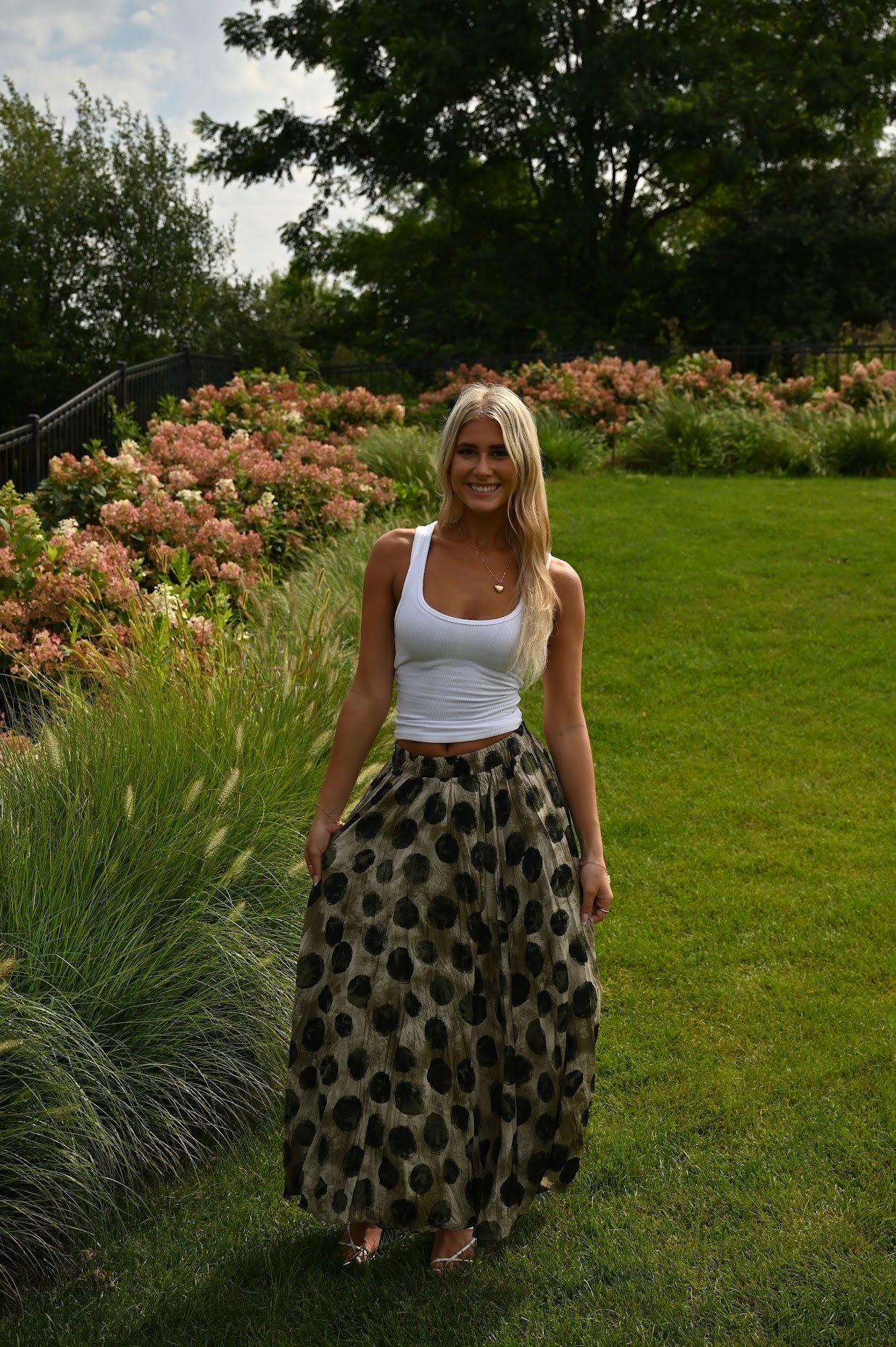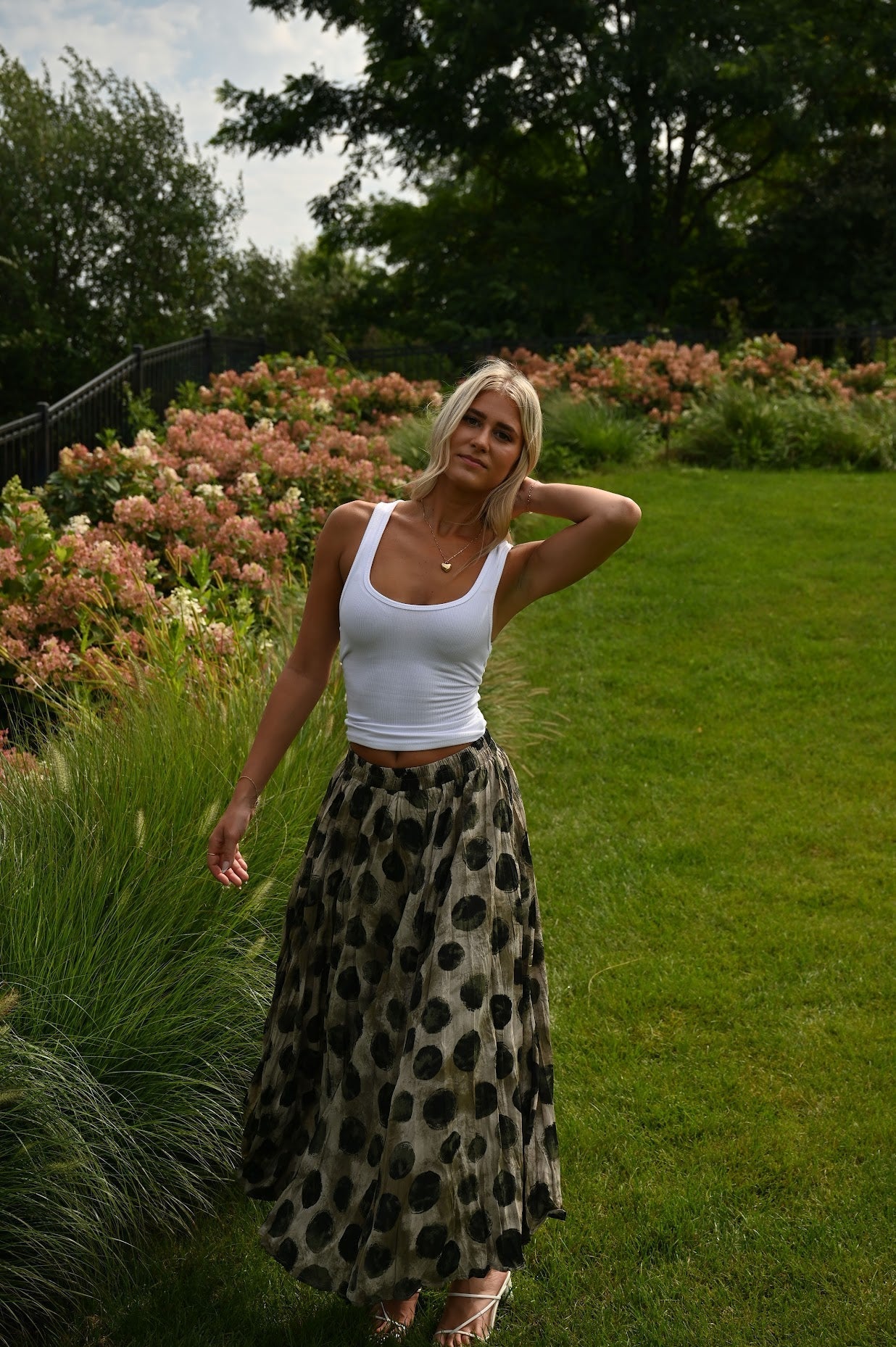 Bring playful charm to your wardrobe with the Twirl Away Skirt. This polka dot pleated maxi skirt sways beautifully with every step, perfect for dancing through sunny days or evening strolls. Lightweight and flowing, it adds a whimsical touch while keeping you comfortable all day long. Embrace fun and elegance in one twirl!