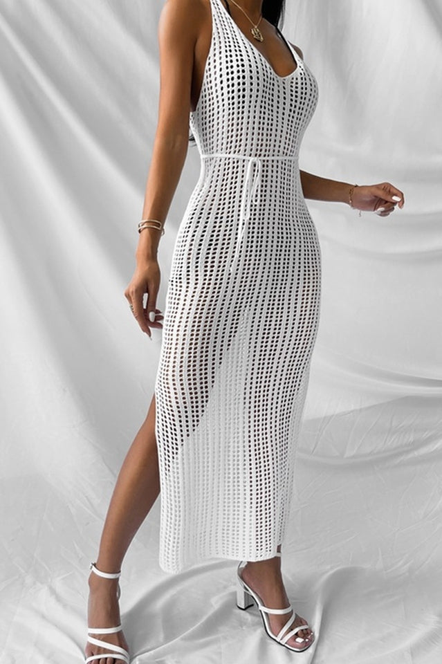 Introducing our Knitted V Neck Side Split Beachwear Cover Up Dress, a must-have for any beach lover! This stunning dress is crafted from high-quality knitted material, ensuring both comfort and durability. The sleeveless design is perfect for those hot summer days, while the V-neck adds a touch of elegance to your beach look.