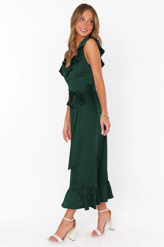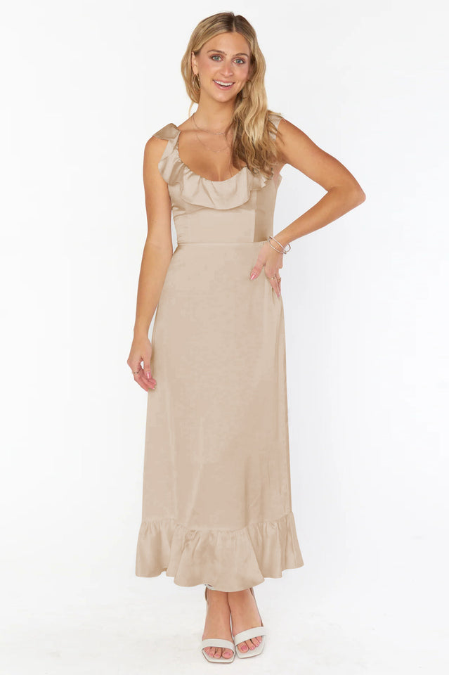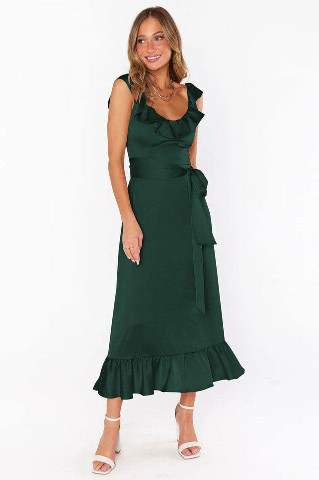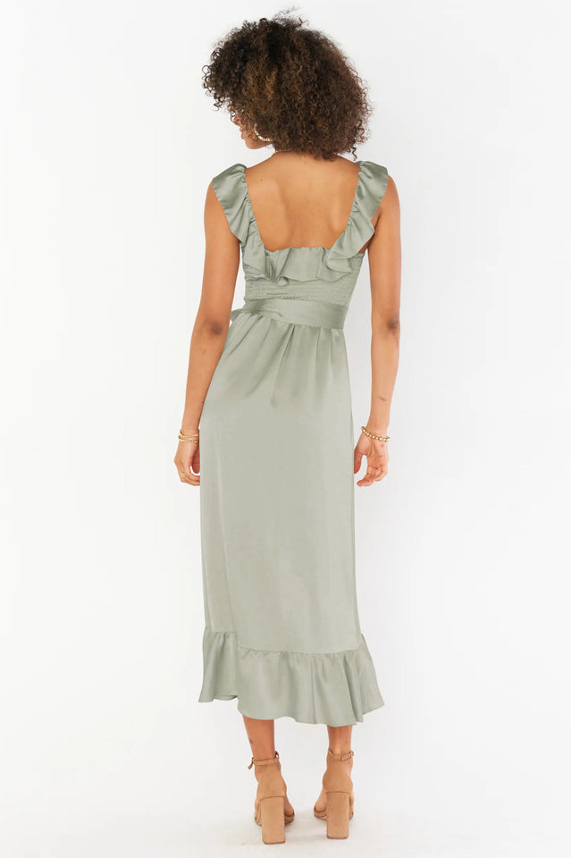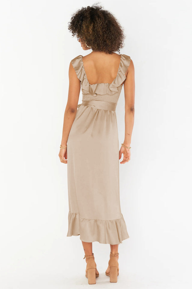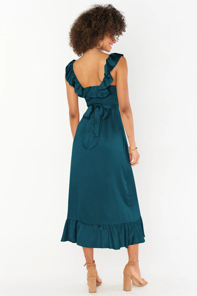 Ruffled to perfection. this dress isn't your everyday midi! A square neckline and tank top straps lay the foundation for a simple silhouette. while dainty details including a waist ribbon and smocked back elevate it. Show up and show out at all this seasons events.