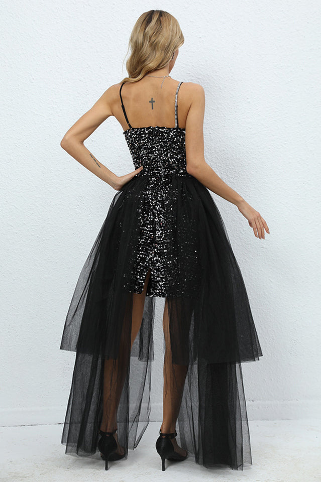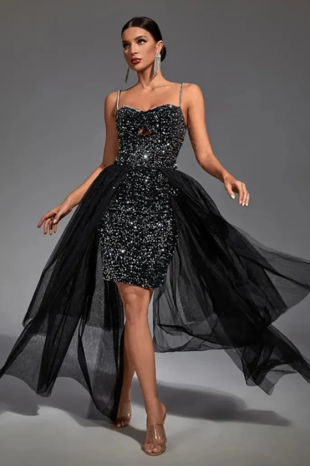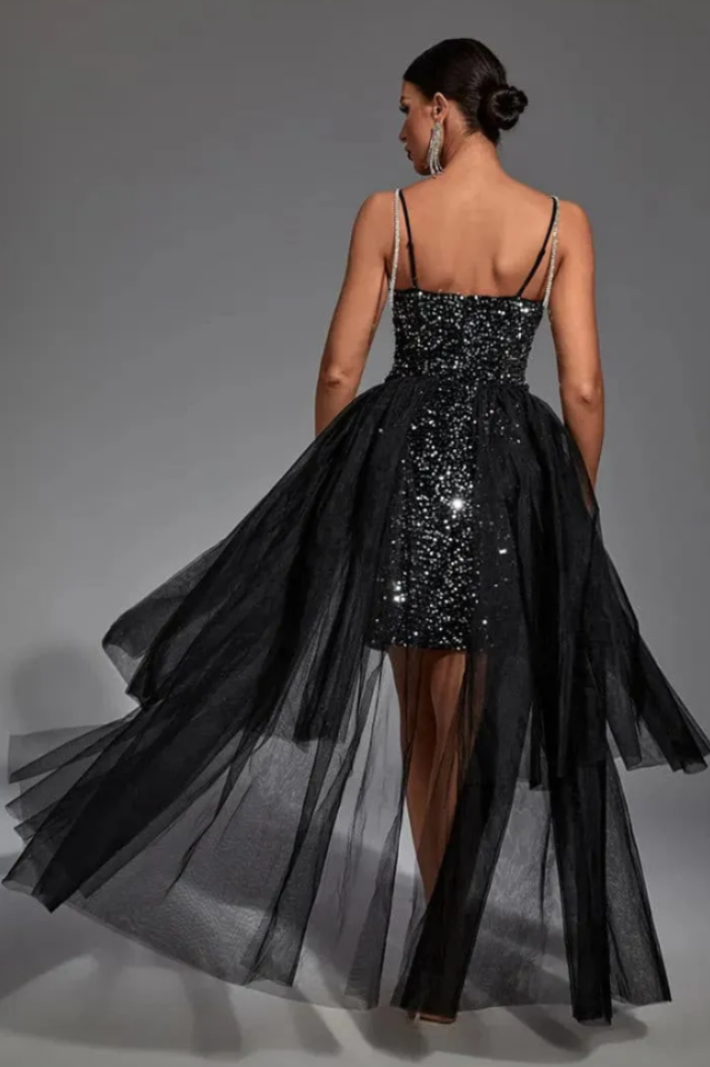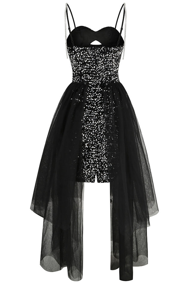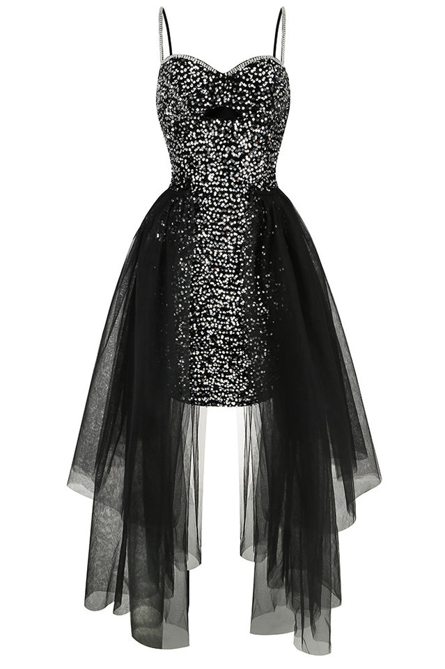 Make a splash this season in our Ariel Black Sequin Diamante Dress. Dress in sequined fabric with diamante details. The mesh skirt can well modify the figure. Let's go to the party! Perfect with heels!
