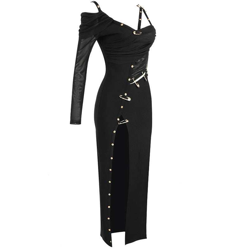 Asymmetric High Slit Pin Trim CutOut Drape Bandage Maxi Dress - Black