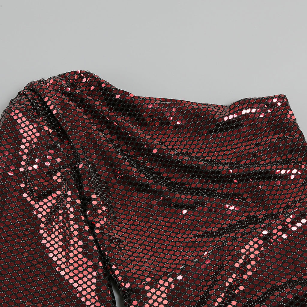 Asymmetric One Shoulder Puff Sleeve Ruched Sequin Mini Dress - Burgundy