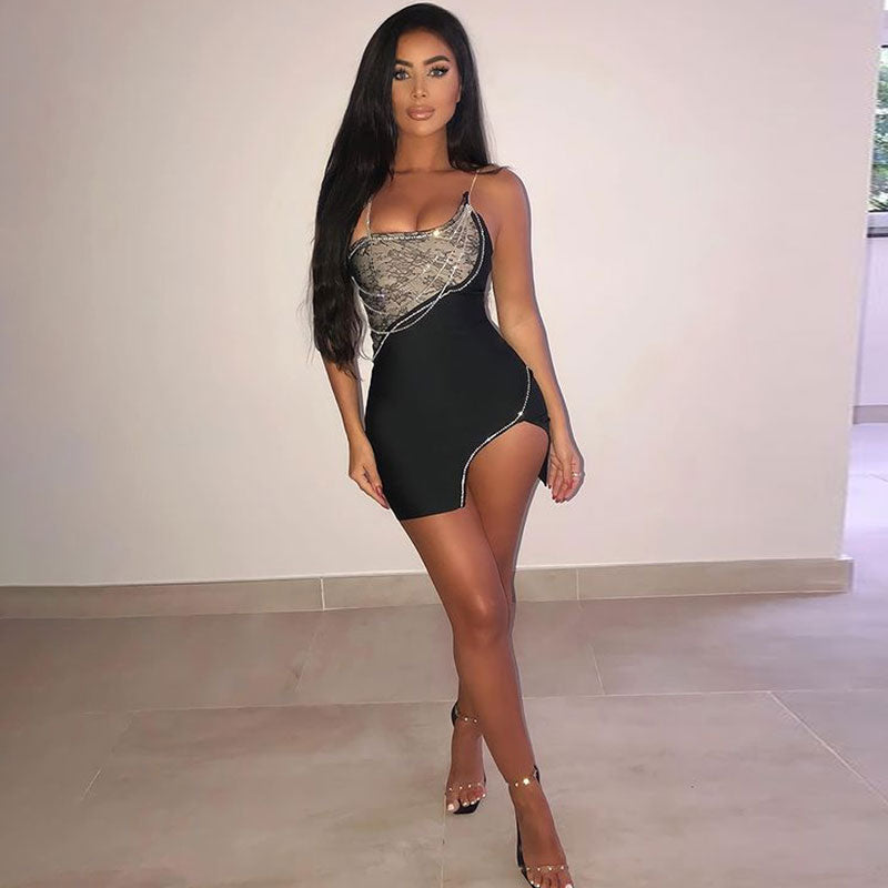 Asymmetric Rhinestone Chain Embellished Lace Panel Split Mini Party Dress