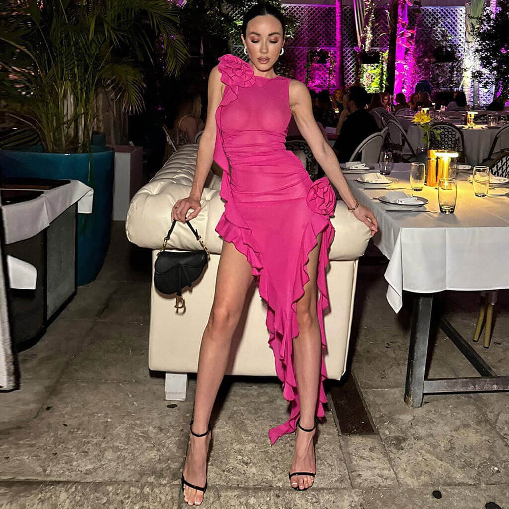 Asymmetrical Ruffle Hem Floral Corsage Sheer Mesh Sleeveless Midi Party Dress