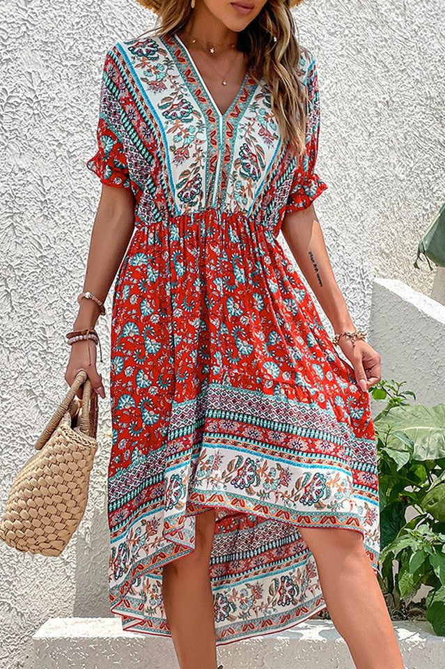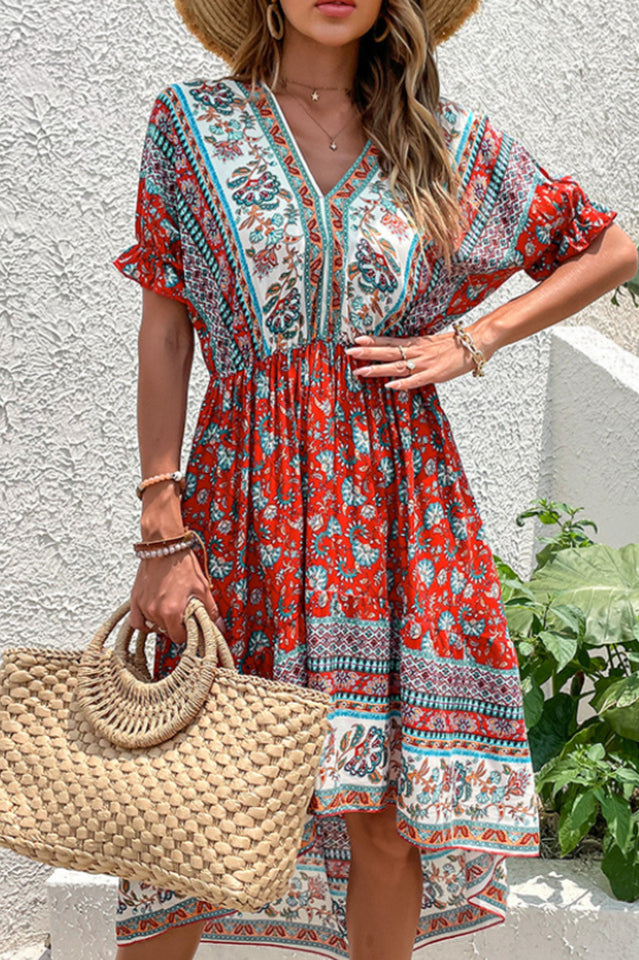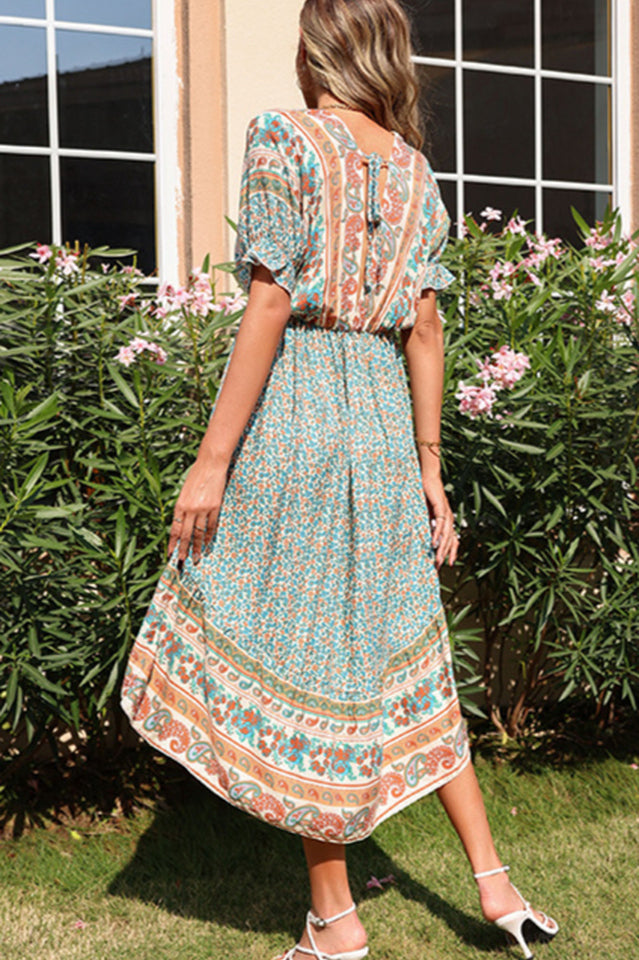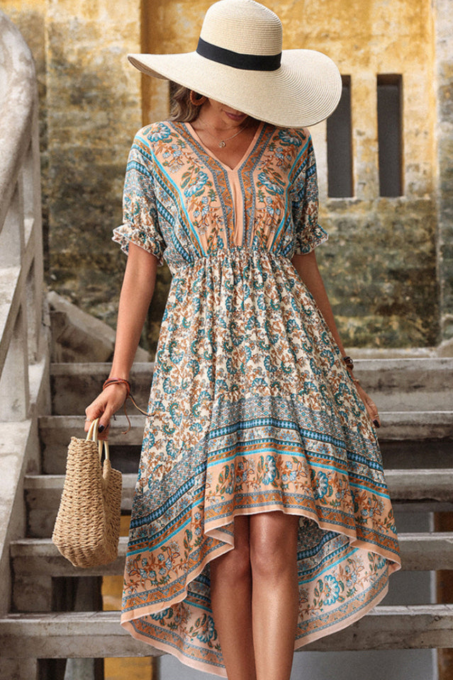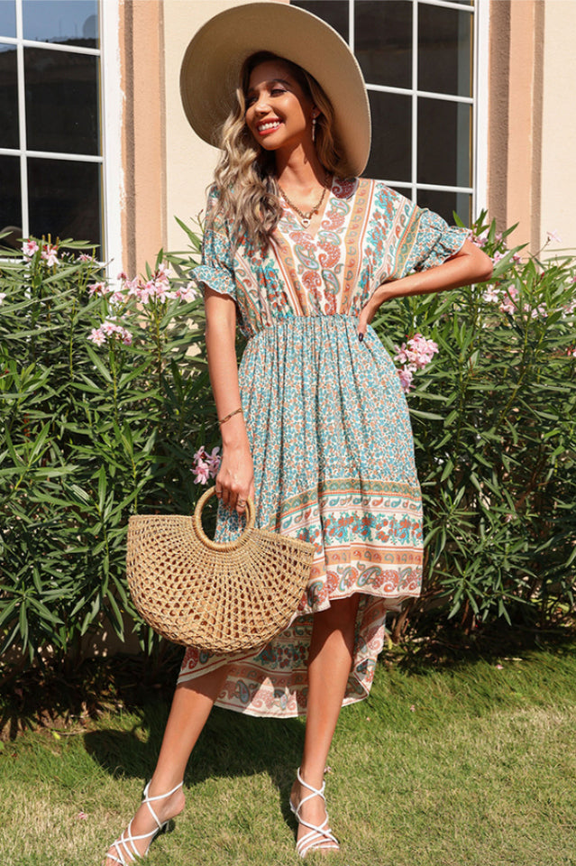 The ultimate in breezy and boho chic. this printed dress is a perfect piece for a day at the beach. The vibrant colors and the lantern sleeves are perfect for a hot summer day.