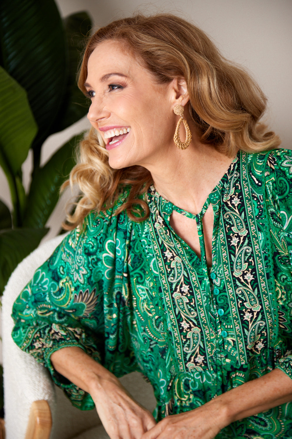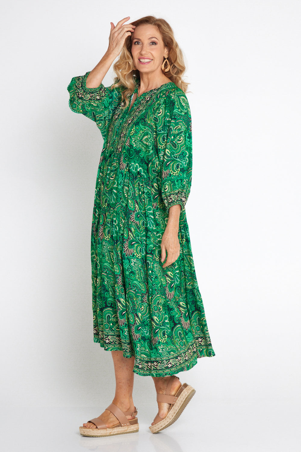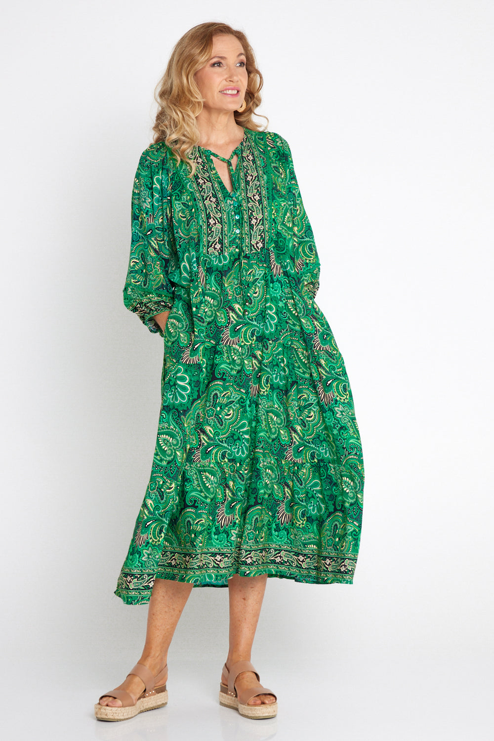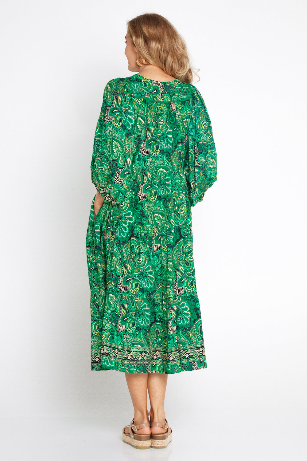 Step into effortless style with the Charmaine Dress by BOHO. This dress features a round neck with ties, offering the option for a flattering V-neck look. Three-quarter sleeves with gathered cuffs and side pockets add to its relaxed elegance. With a flowing silhouette and tiered skirt layers, this dress is perfect for breezy days and casual outings. The beautiful emerald paisley print adds a touch of bohemian charm to your wardrobe.