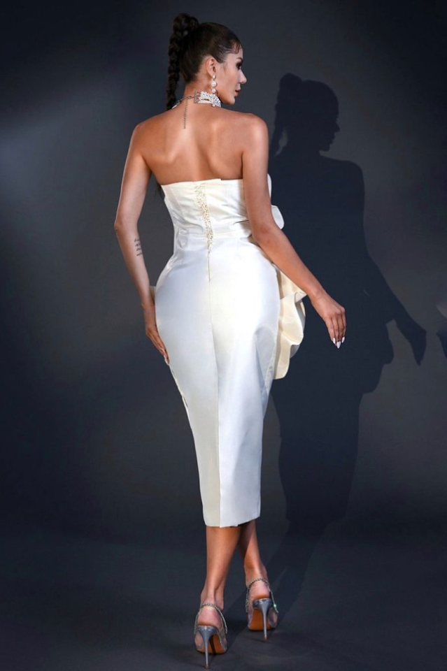 Introducing the Clair Floral Midi. This intricately crafted strapless midi dress is meticulously tailored from the finest textured ivory satin, ensuring both luxury and comfort on your special day. Adorned with a breathtaking three-dimensional floral embellishment, this voluminous piece offers a contemporary take on timeless elegance.