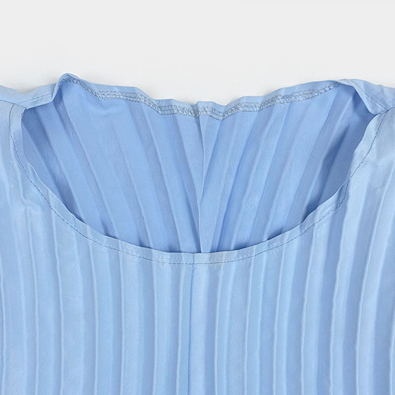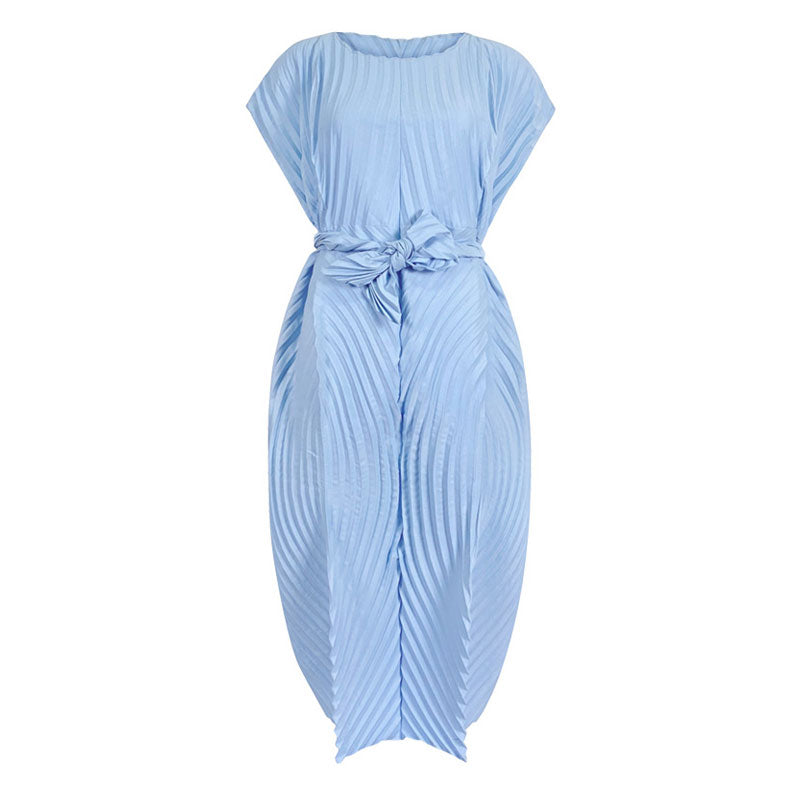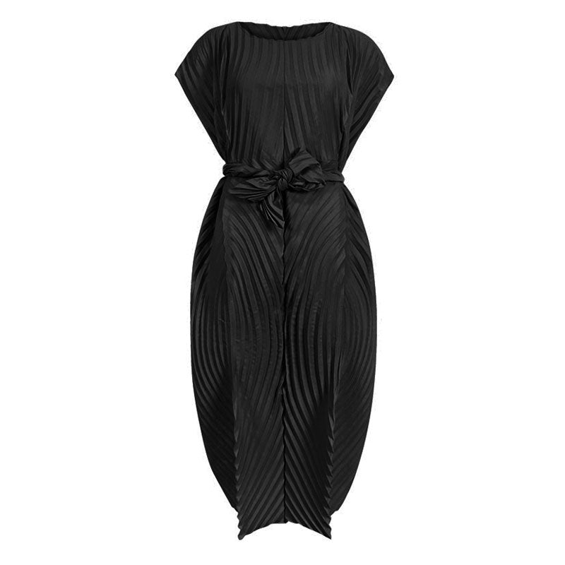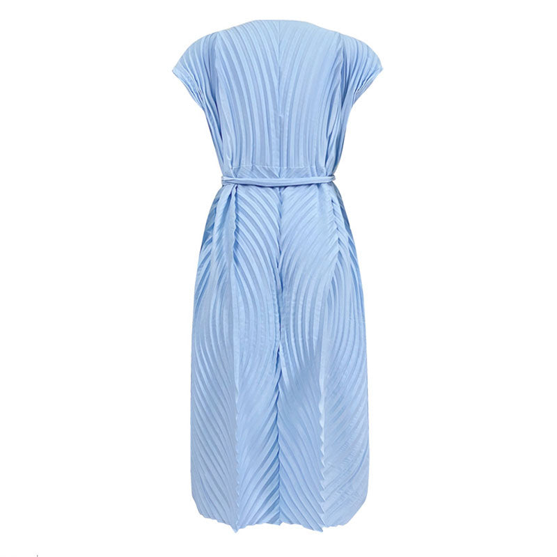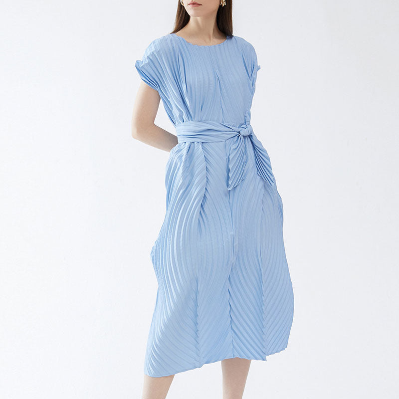 Classic Round Neck Short Sleeve Tie Waist Wavy Pleated Midi Dress
