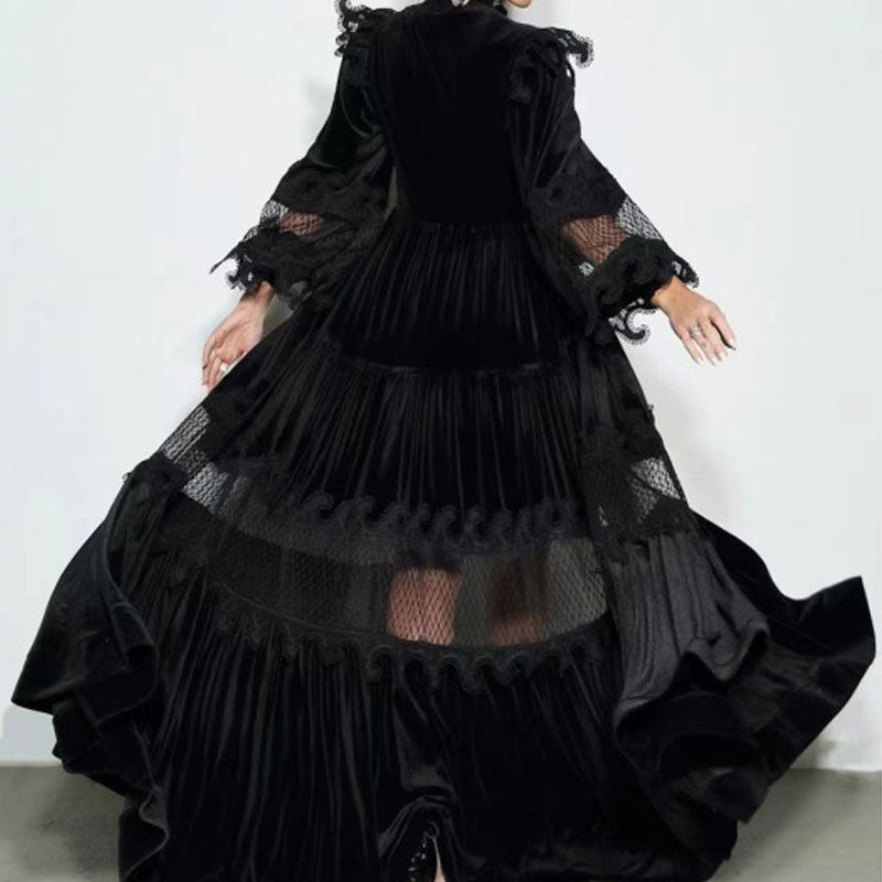 One easy way to accomplish a more dressed-up look is to stock up on evening dresses. Here is the holiday-ready dress for you. Featuring a high neckline. faux pearl button detail and long puffy sleeves. the mysterious black piece is in a paneling design with the sheer mesh and ruffled lace adding a hint of romanticized feel. The charming fit-and-flare cut falls to a tiered floaty floor-length skirt with the flirty front slit. making for a truly elegant silhouette with modernity. Fasten it up with the matching black belt and you will be the princess on the stage.