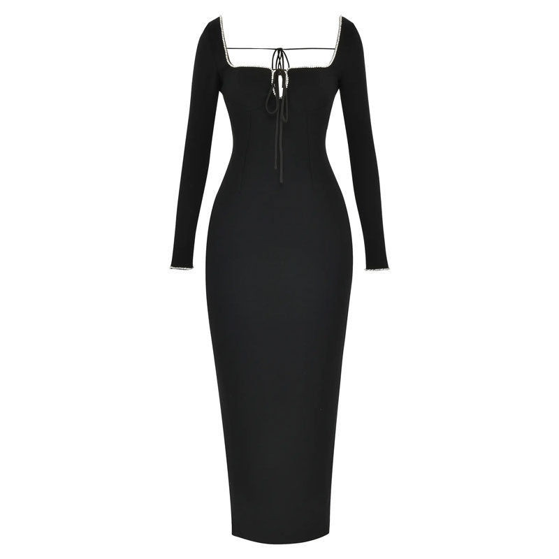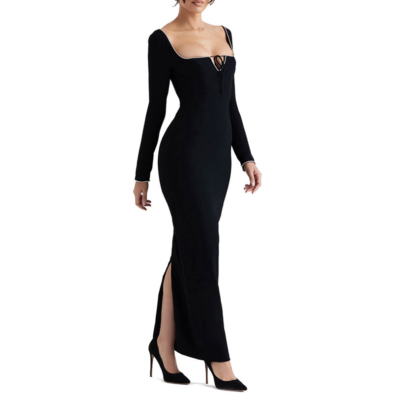 Classy Rhinestone Square Neck Long Sleeve Open Back Maxi Bandage Dress - Black
