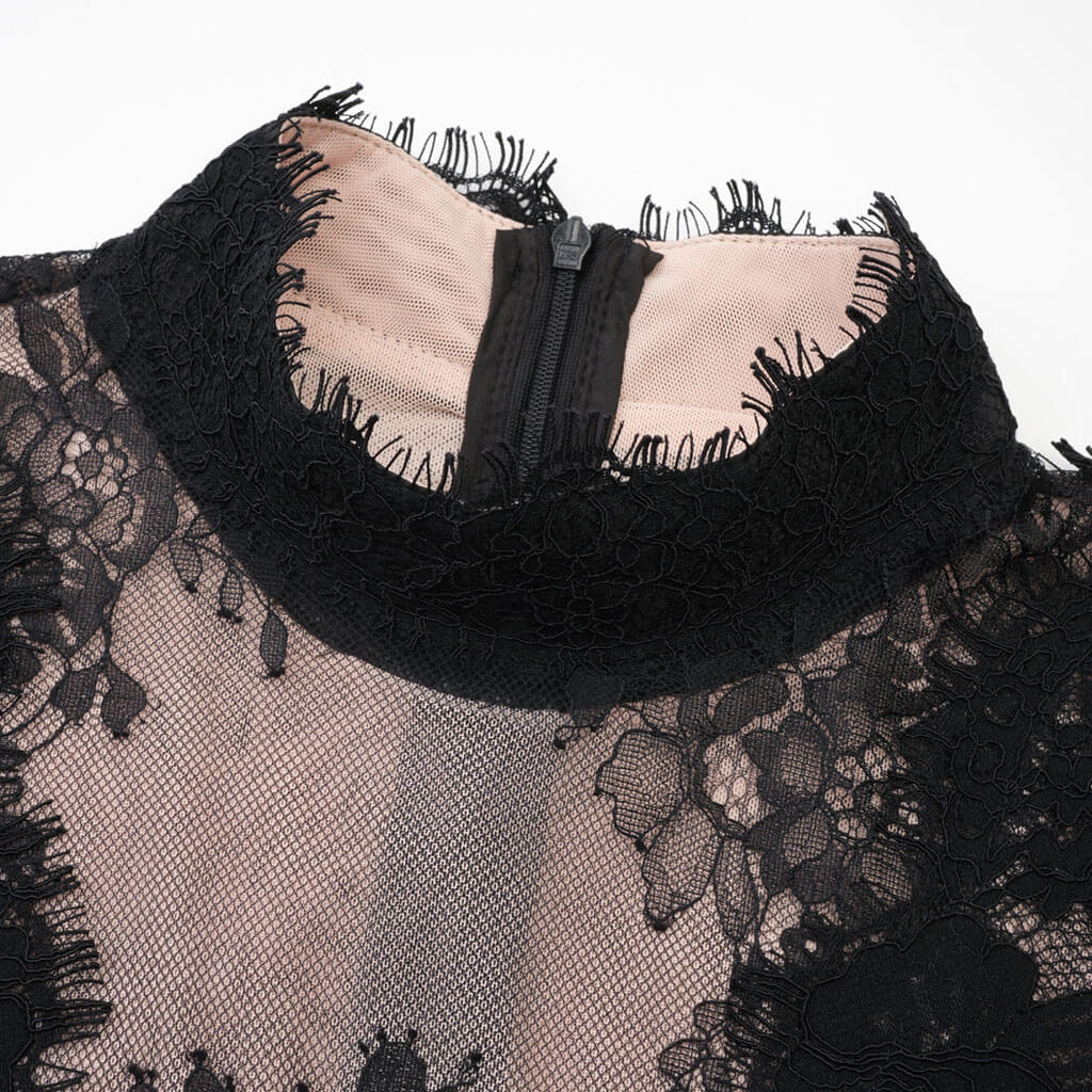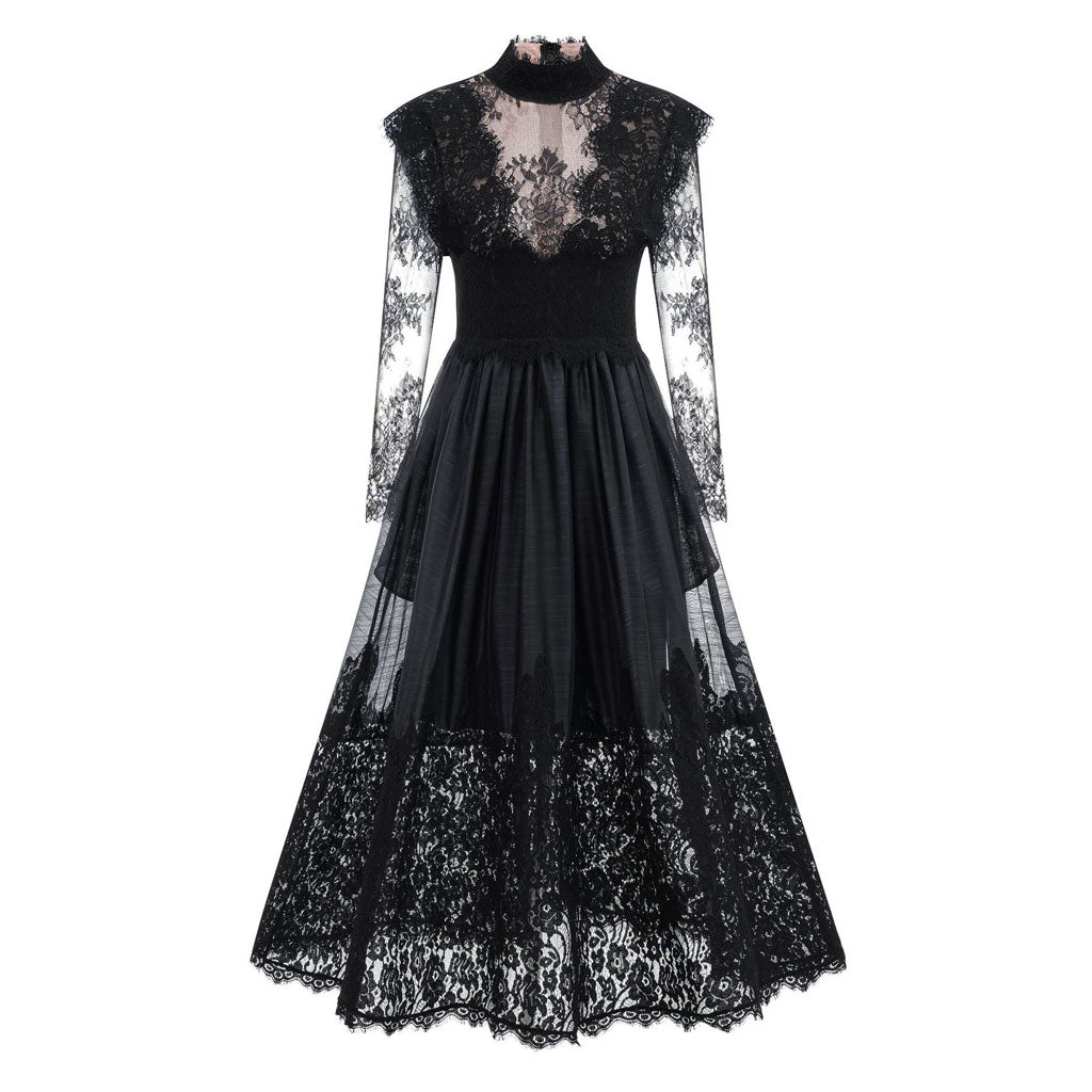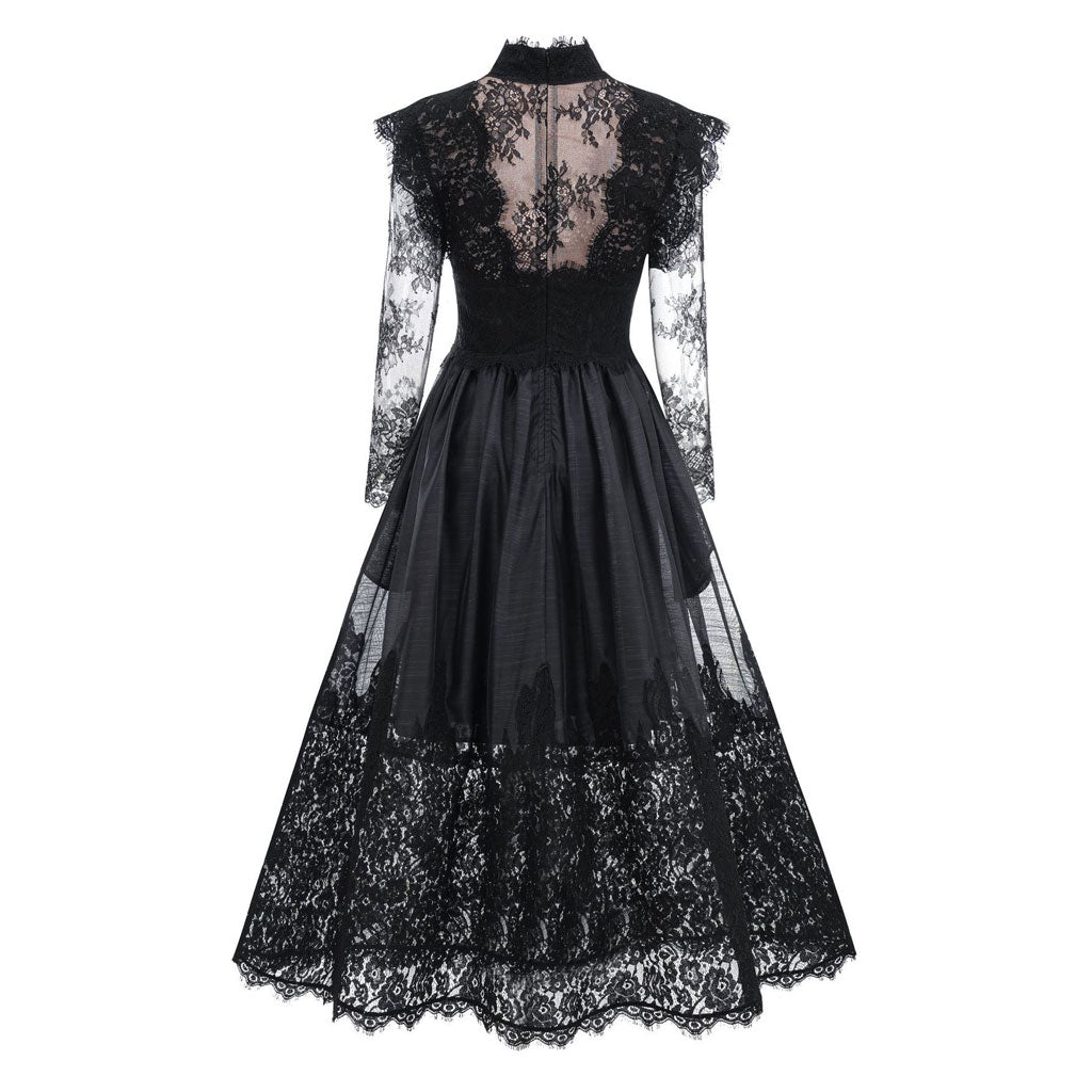 It's cute. stylish. comfortable. retro and sexy. It's the perfect balance between sexy and modest. The long designer floral lace dress showcases a flattering A-line silhouette with the sheer long sleeves and the dainty mock neck for adding an elegant finishing touch. Perfect for the transitioning seasons like spring and fall. the little black dress is versatile for any occasion. A wise investment!