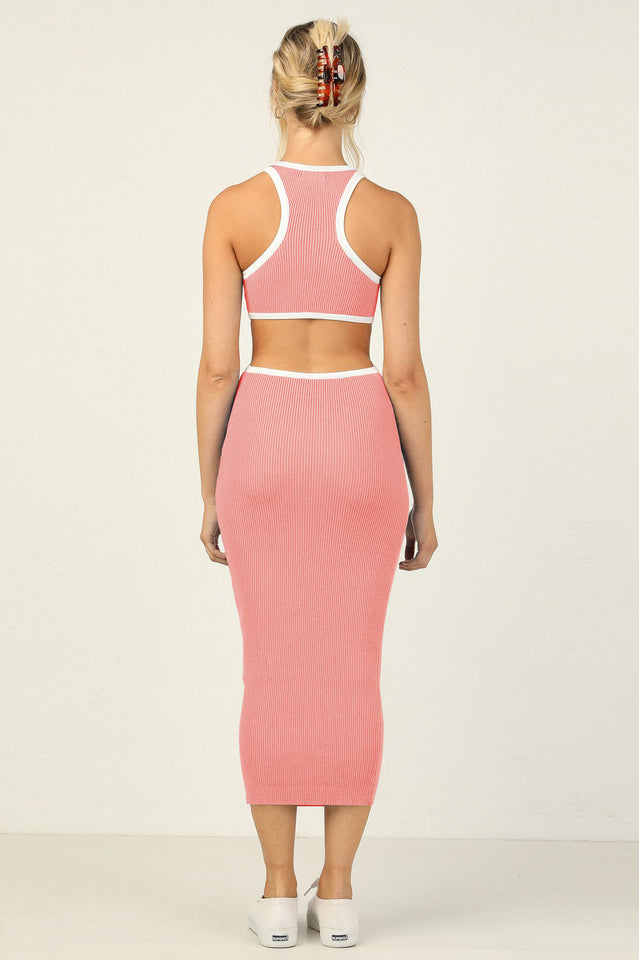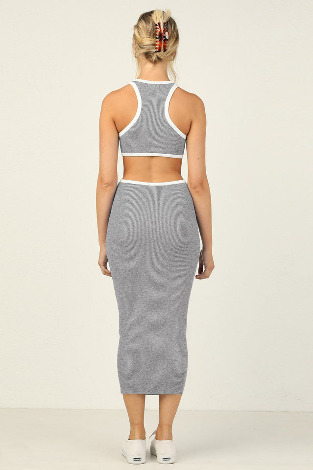 - Contrast binding at neckline. shoulders. and cut outs