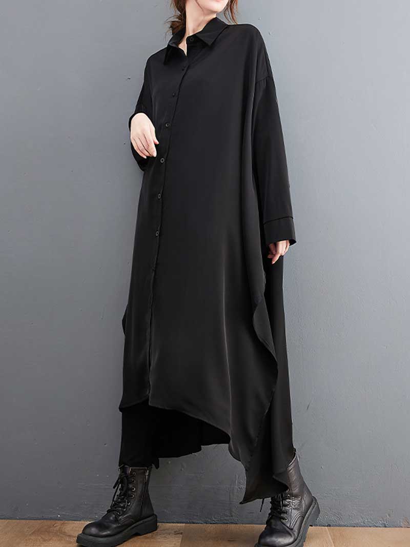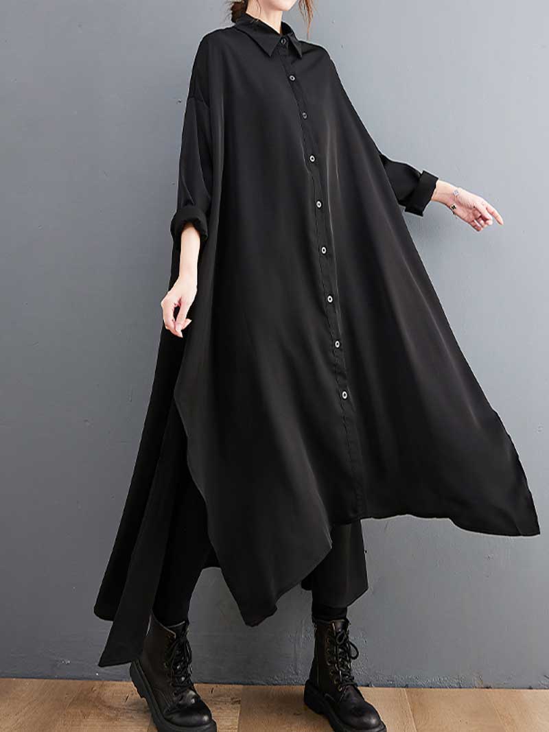 Looking for a dress that's both comfortable and stylish? Check out our Cotton Long Sleeves Shirt Style A-Line Dress! Made from soft. breathable cotton. this dress is perfect for warm summer days. The loose-fit waist and A-line silhouette flatters all body types. while the long sleeves provide added coverage. Choose from a variety of colors. including classic black.