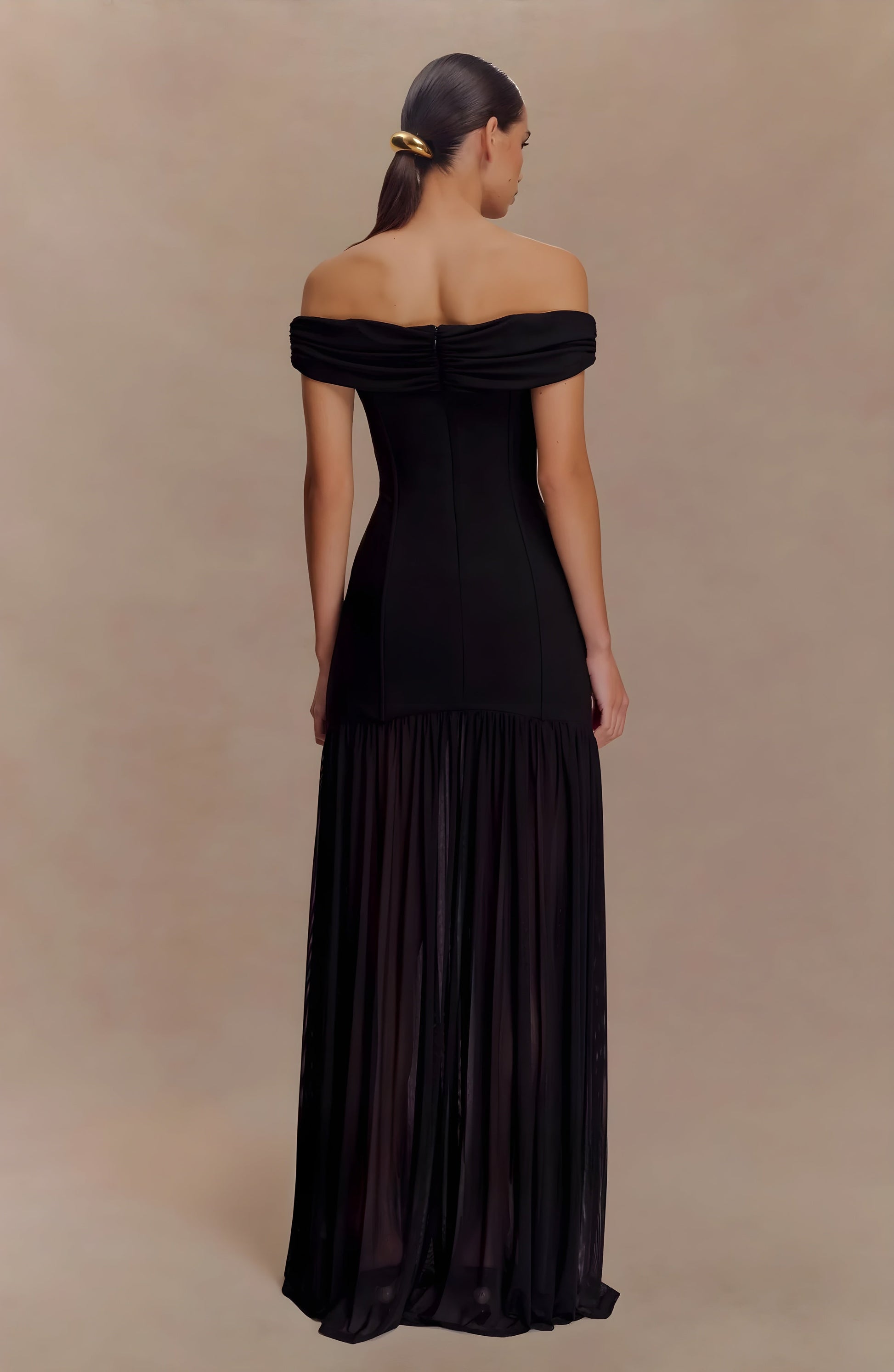 The Crepe Maxi Dress exudes refined drama. Crafted from premium stretch crepe, its off-shoulder silhouette glides over your figure while gold floral embellishments add a touch of luxury. Perfect for formal dinners, events, or special nights out.