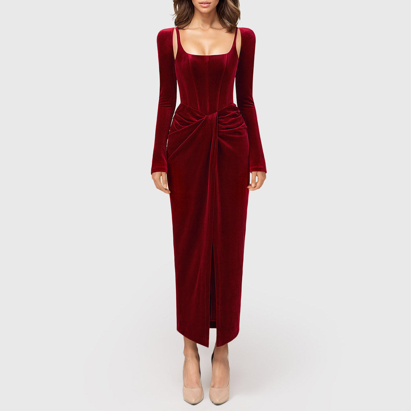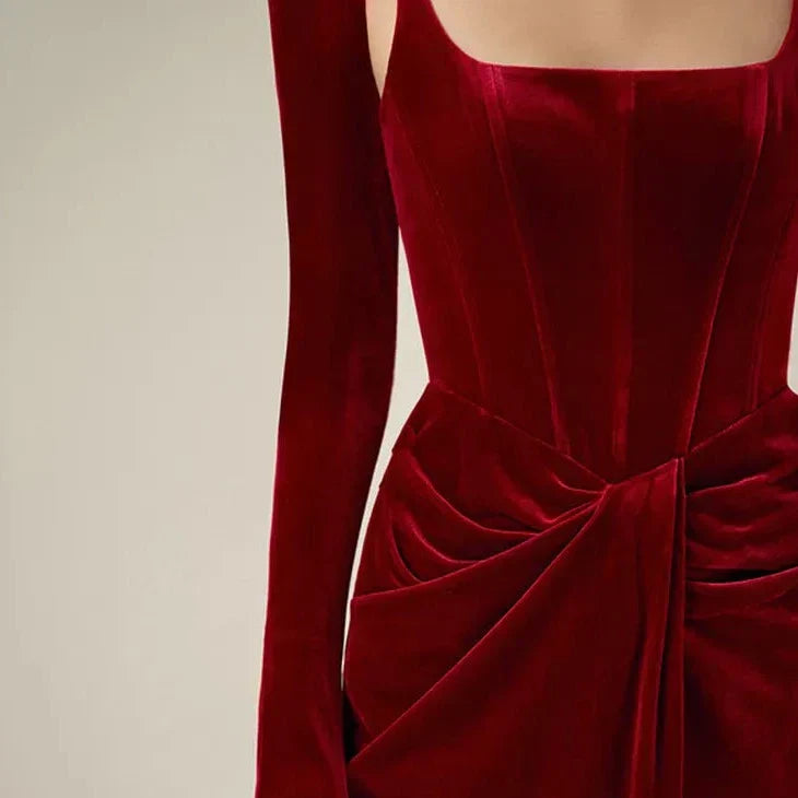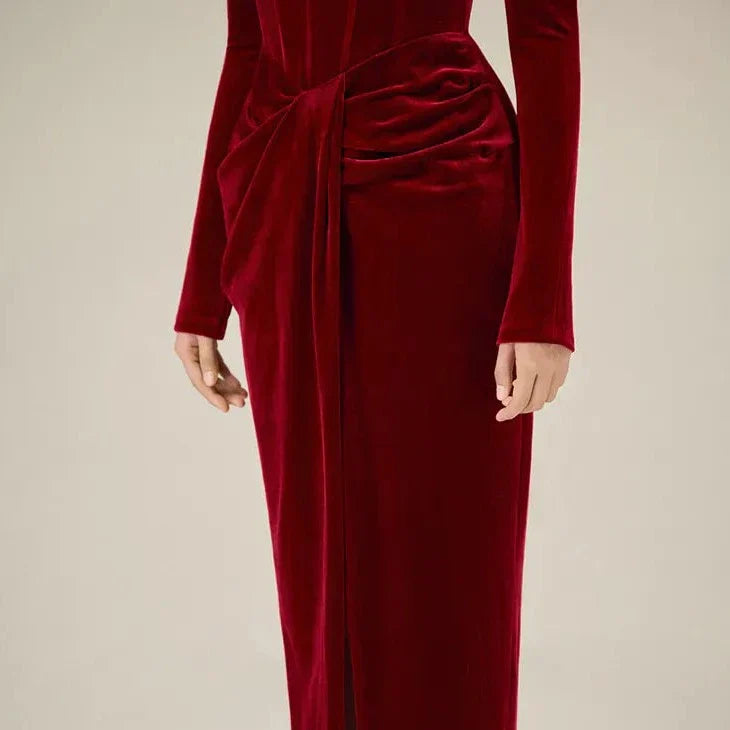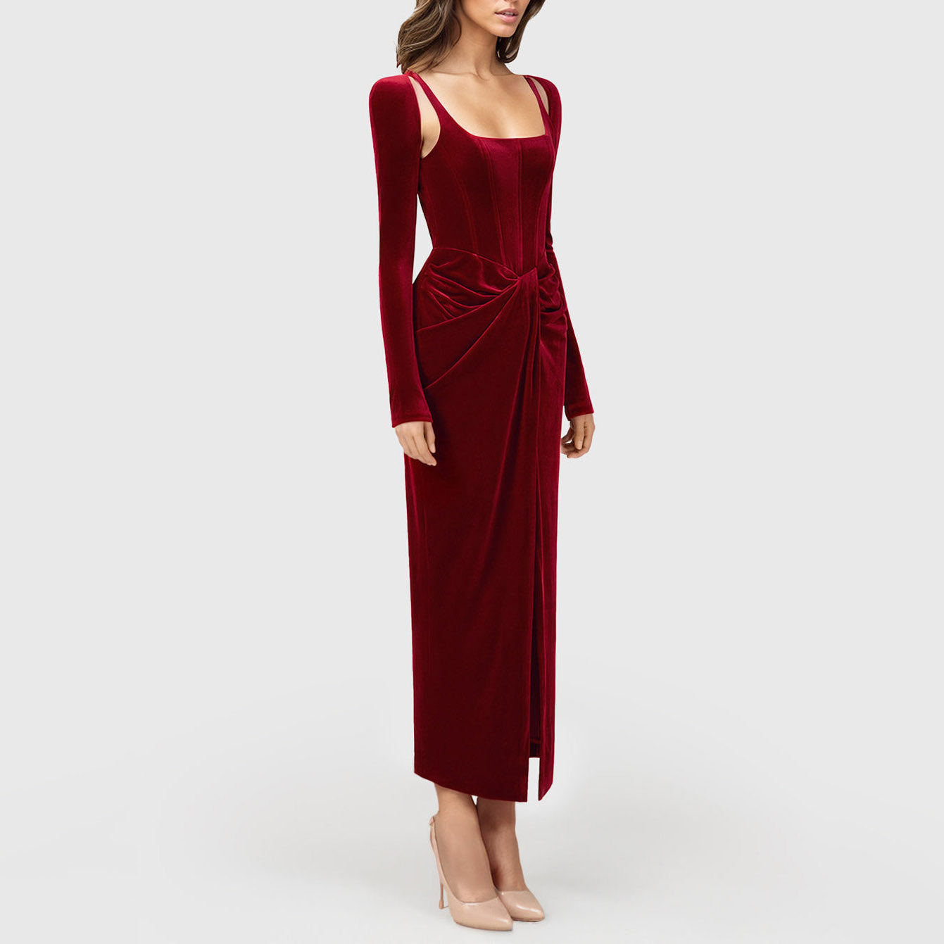 DARK RED MIDI Dress with CORSET Long SleeveS and FRONT SLIT