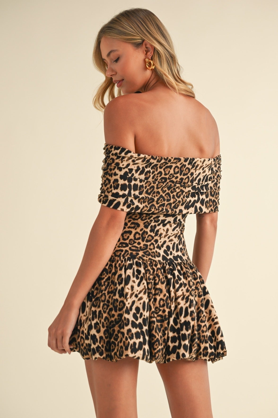 Step out in style with our Editor Select Dress! This leopard printed off shoulder dress is both playful and trendy, perfect for any occasion. The bubble mini dress silhouette adds a unique touch to this already bold piece. Stand out from the crowd and make a statement with this fun and flirty dress!]
