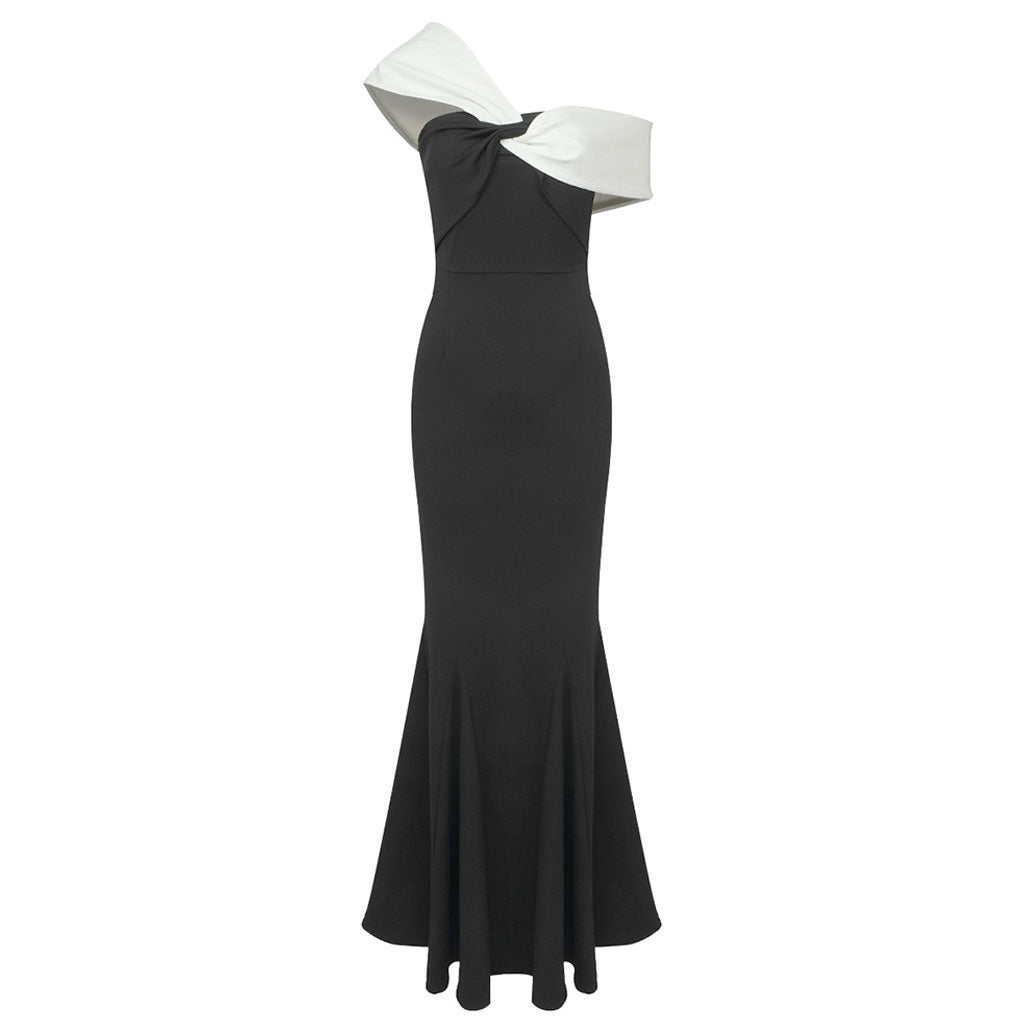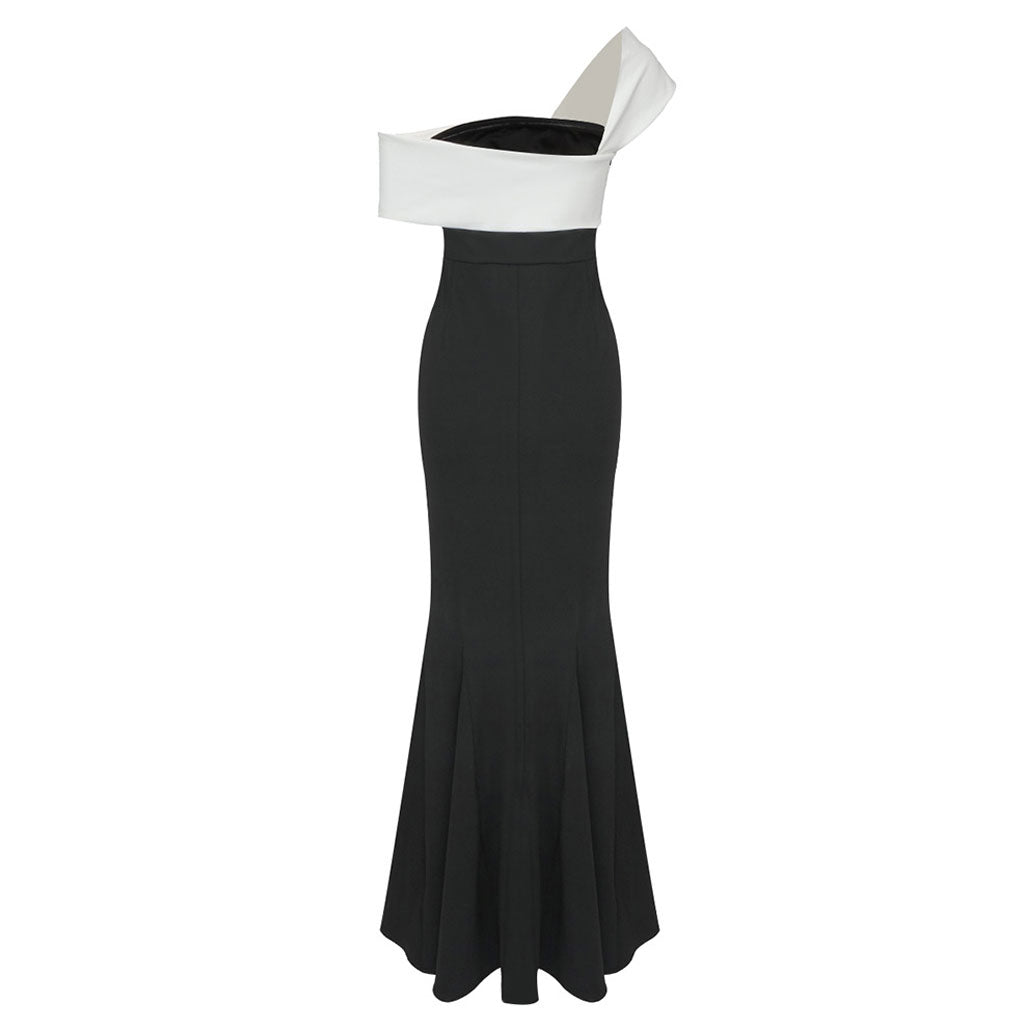 Elegant Style White and Black Twist One Shoulder Jersey Fishtail Maxi Dress