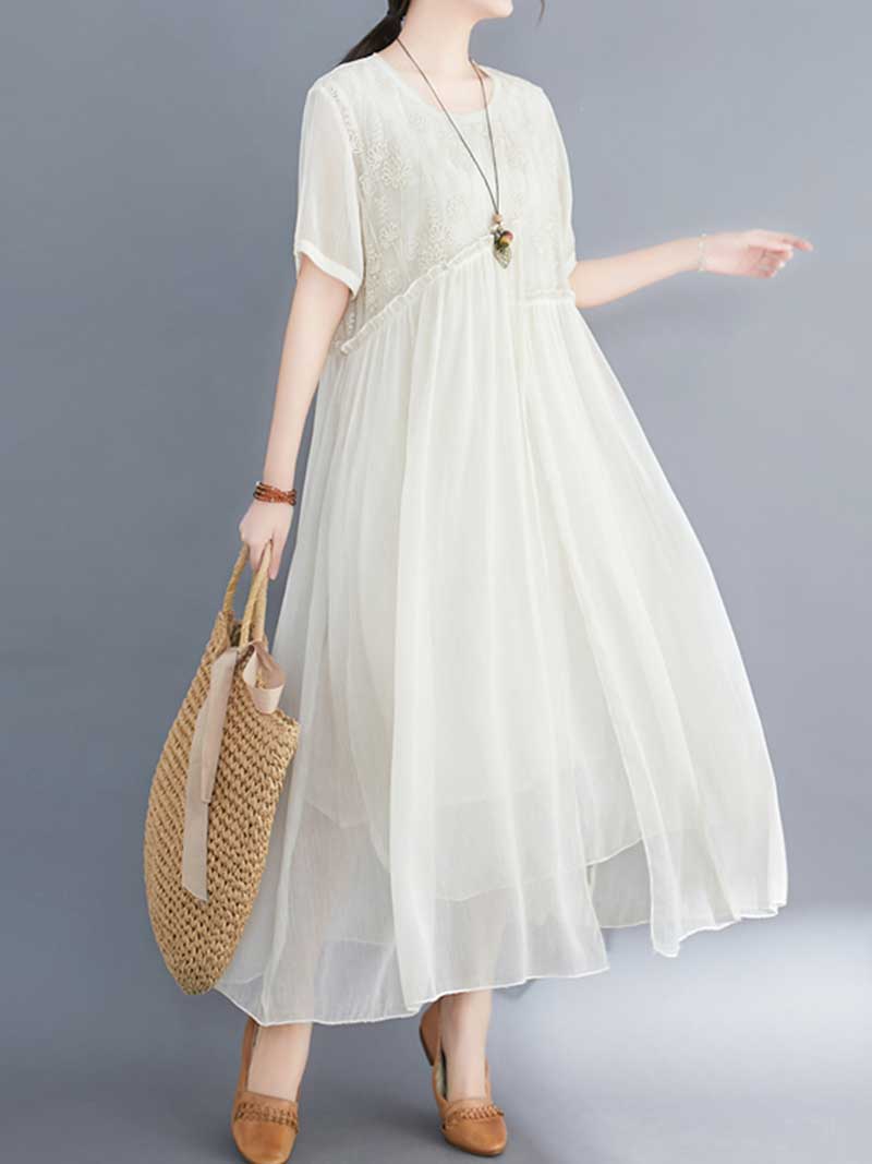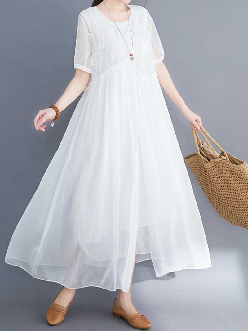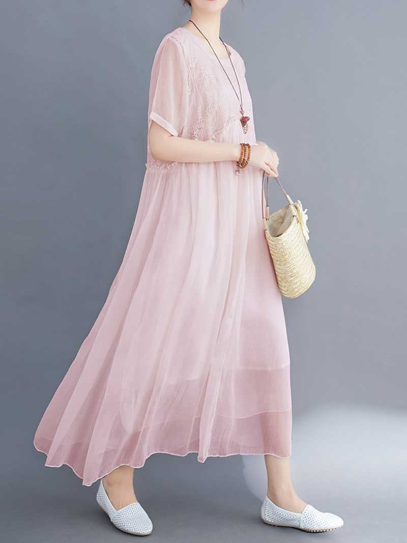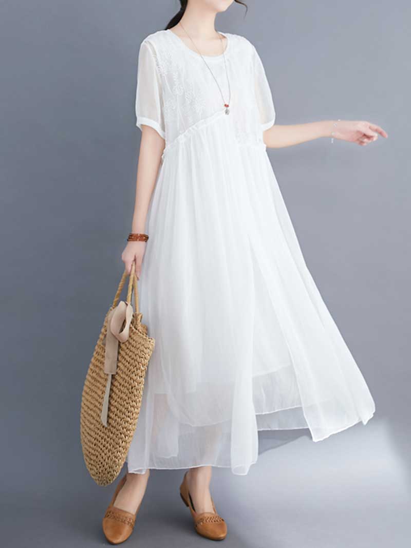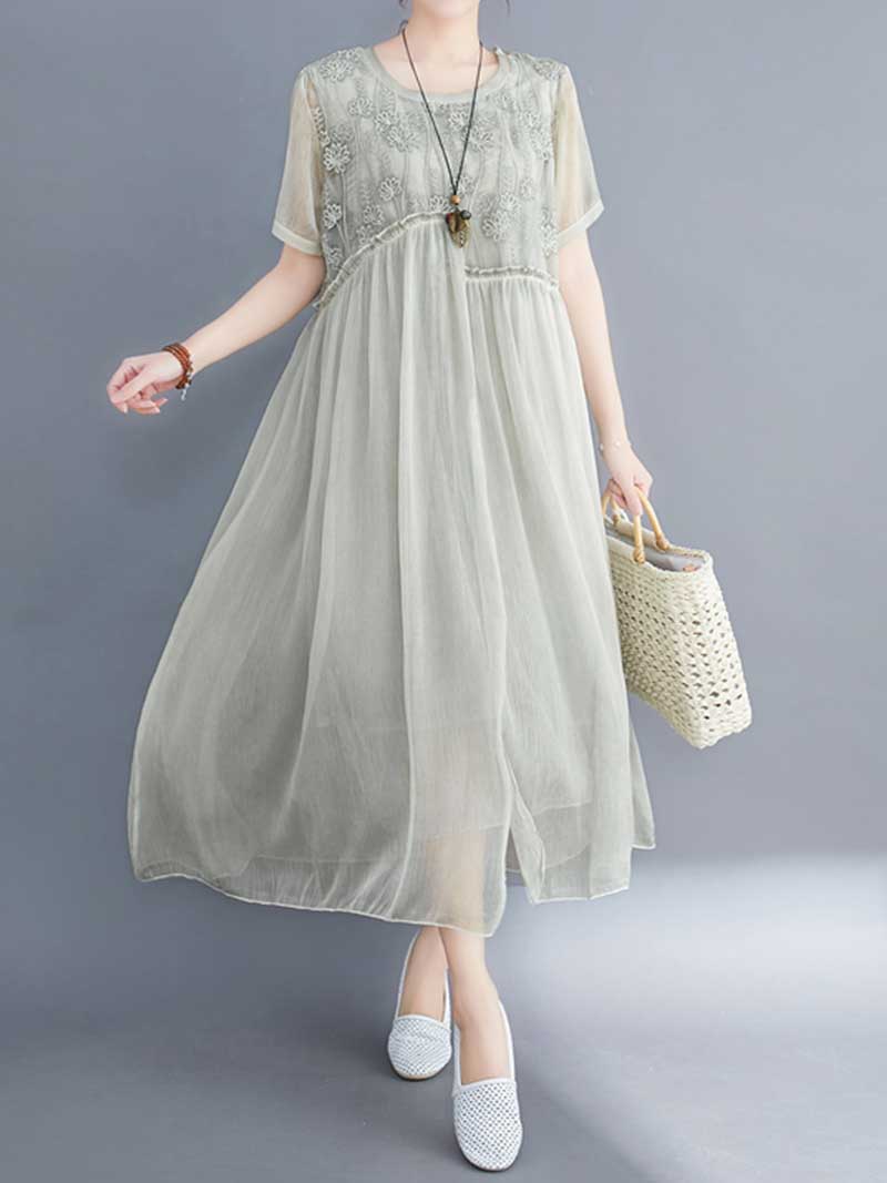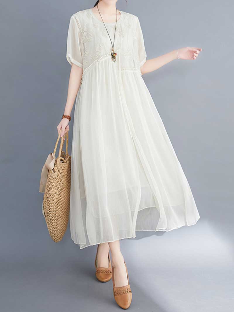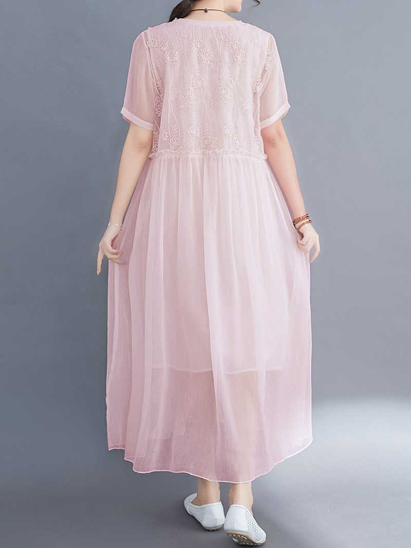 This Embroidered Silk Round-Neck A-Line Dress is the perfect choice for a summer or spring day. Made of 51% to 70% silk. it is lightweight and comfortable to wear. The round neck and regular sleeve length make it easy to style for any occasion. The embroidered detail adds a touch of elegance. The dress is available in black. apricot. white. pink. and lake-green.