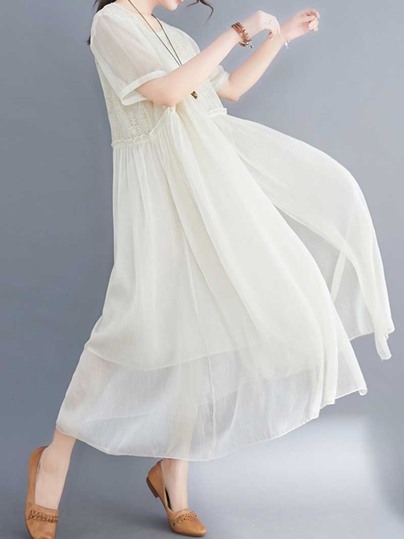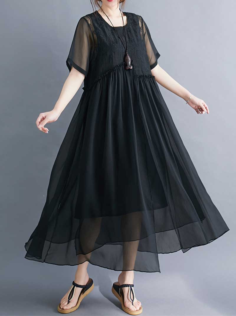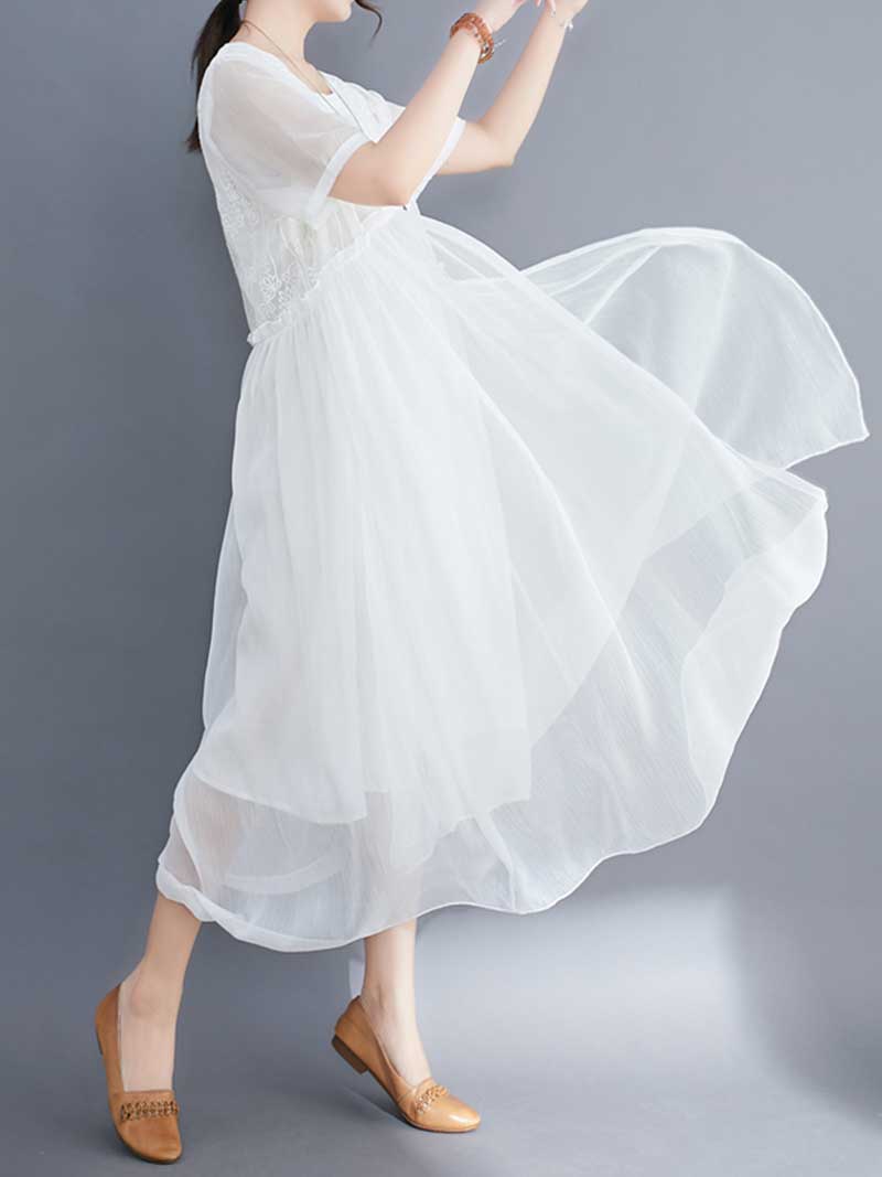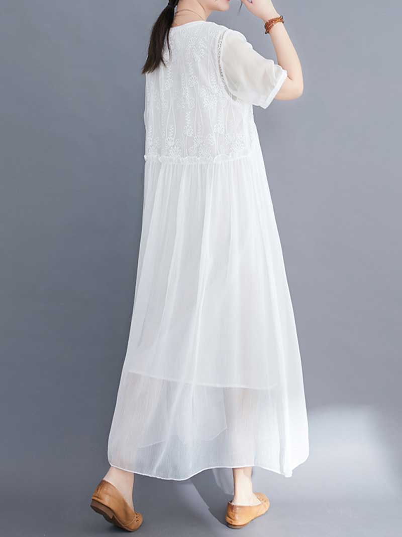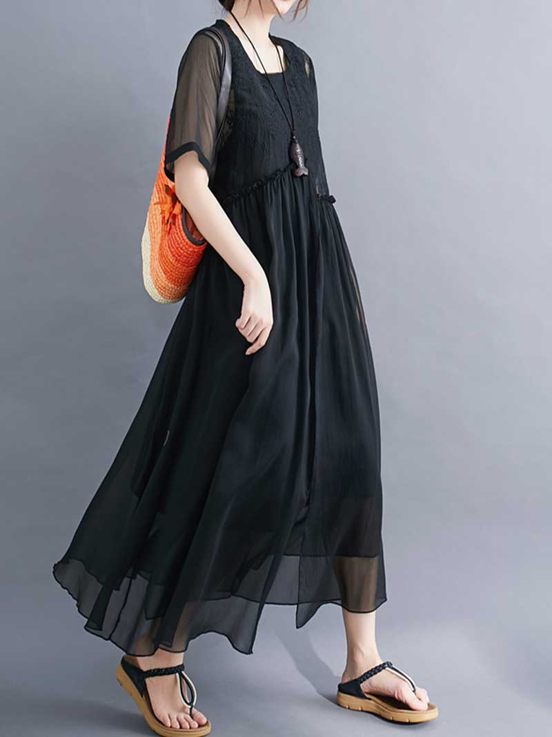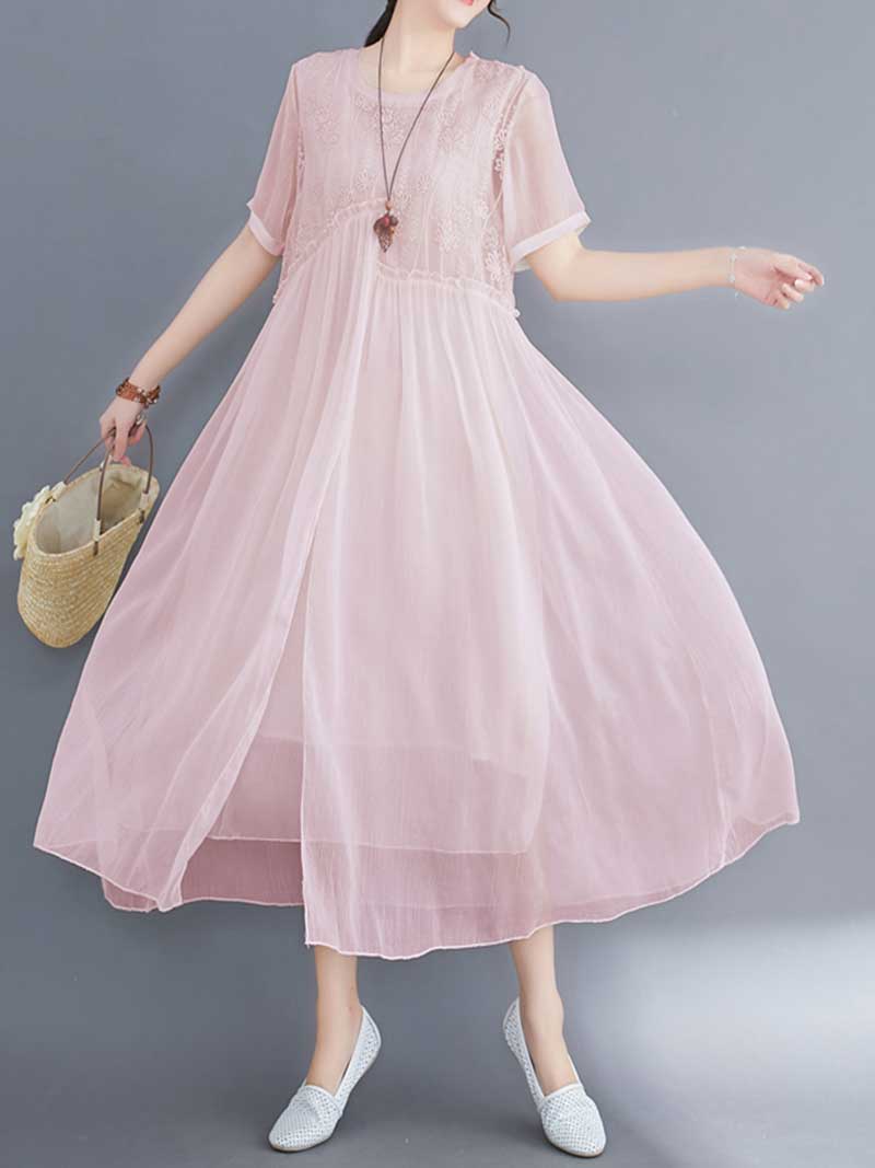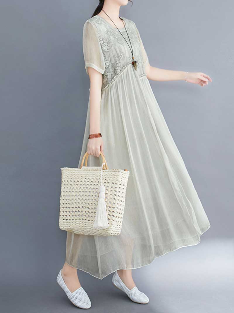 This Embroidered Silk Round-Neck A-Line Dress is the perfect choice for a summer or spring day. Made of 51% to 70% silk. it is lightweight and comfortable to wear. The round neck and regular sleeve length make it easy to style for any occasion. The embroidered detail adds a touch of elegance. The dress is available in black. apricot. white. pink. and lake-green.