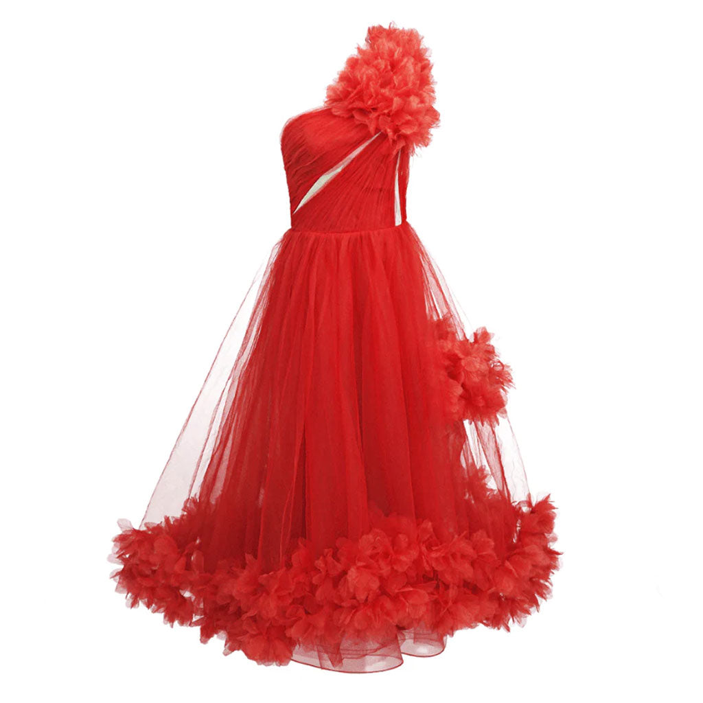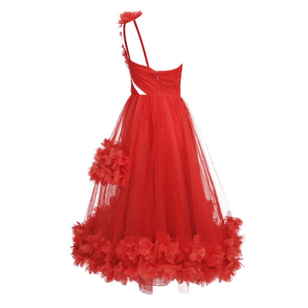 Exaggerated 3D Floral Applique Tulle One Shoulder Fit and Flare Gown Maxi Dress