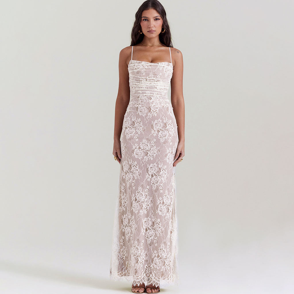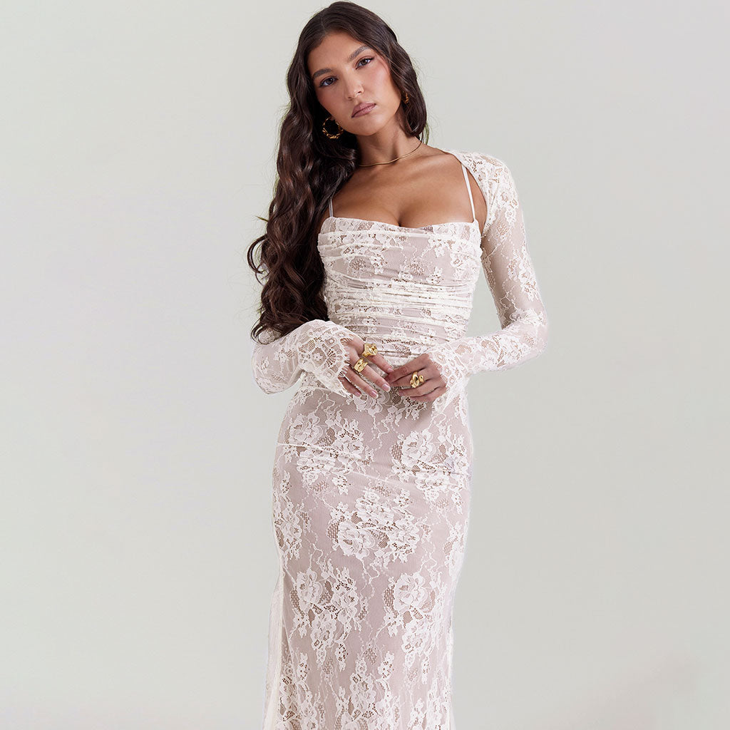 Exquisite Shrug Spaghetti Strap Sleeveless Ruched Evening Maxi Floral Lace Dress