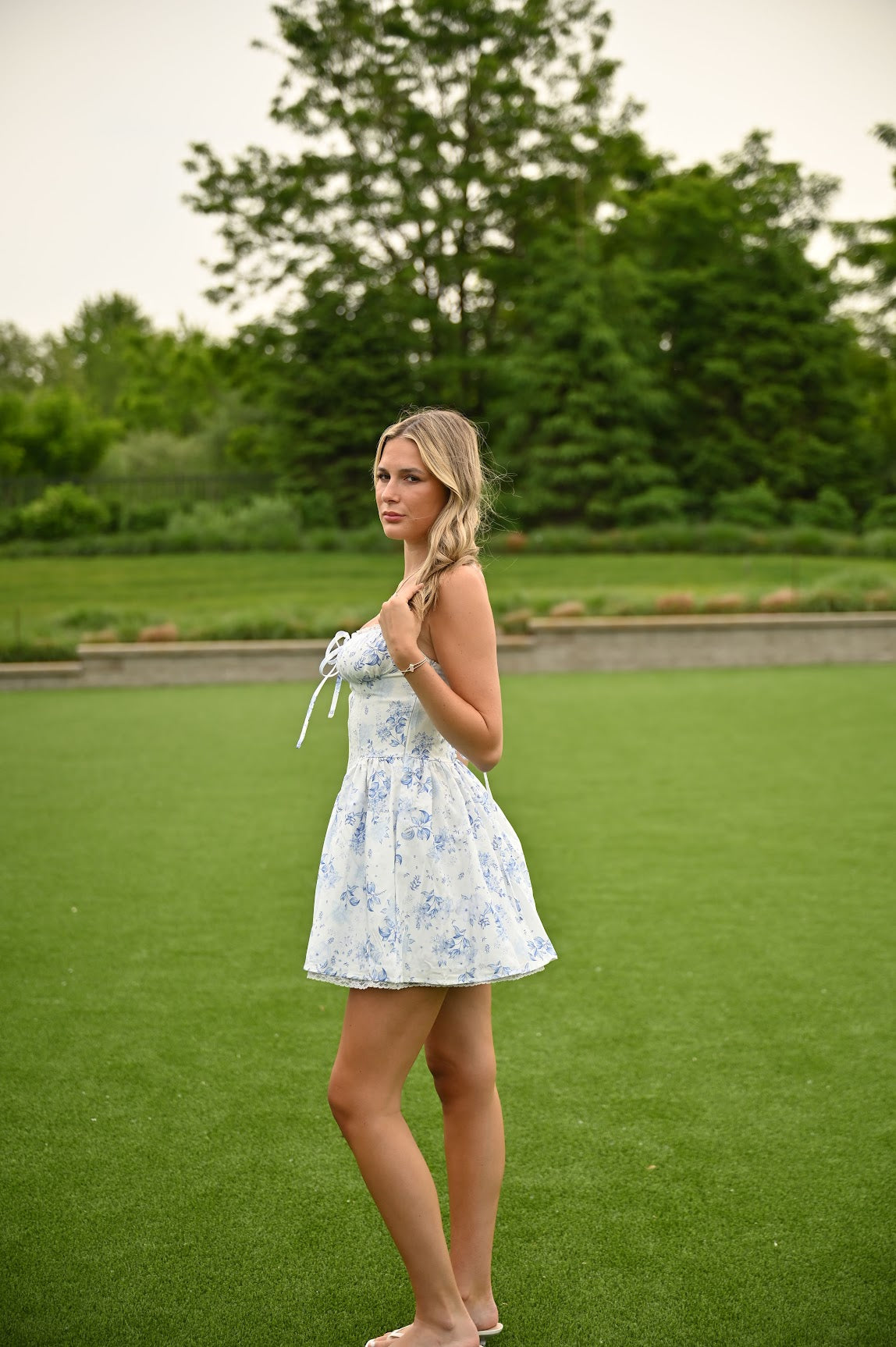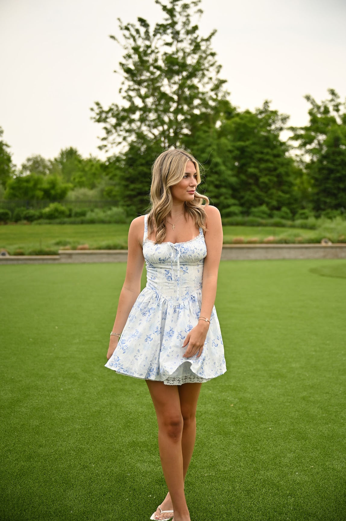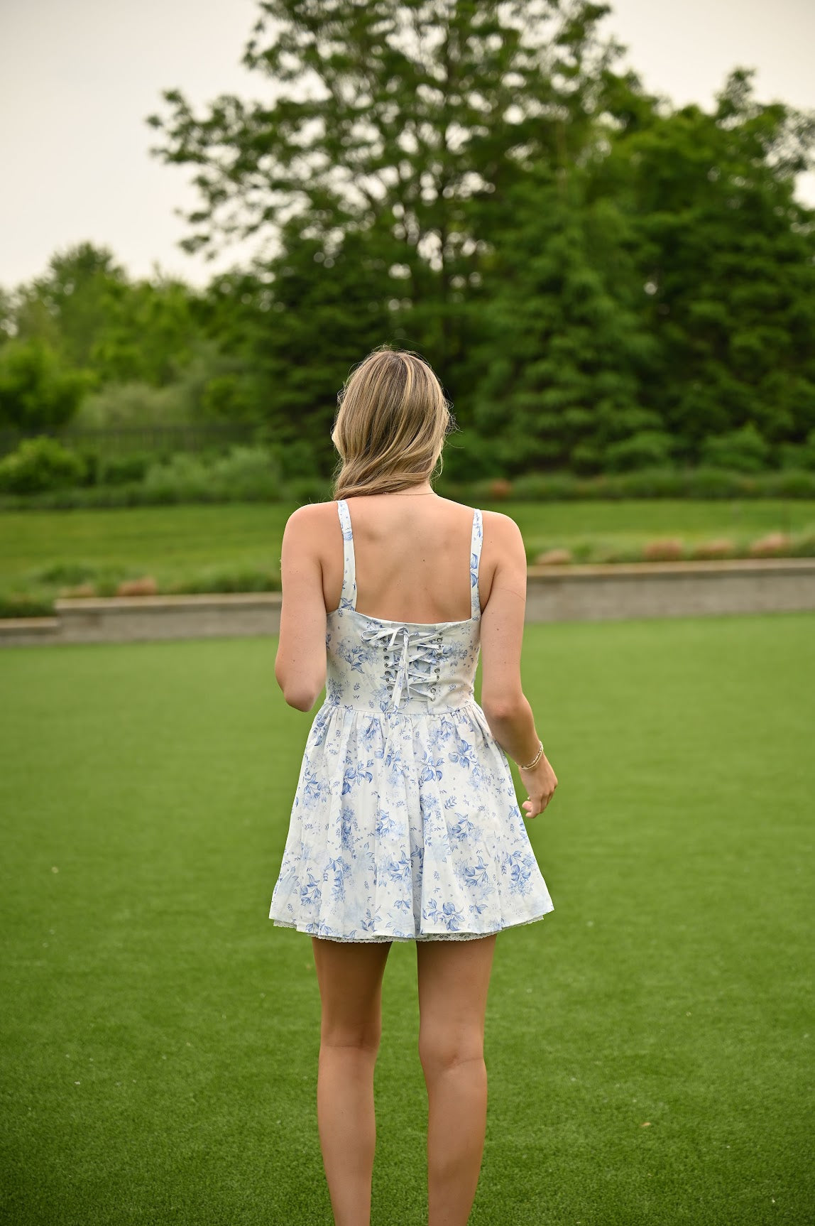 This blue floral corset dress brings out your inner fairy with its girly and playful design. The printed pattern adds a touch of whimsy, while the corset accentuates your figure. Perfect for a fun night out or a casual day at the park.