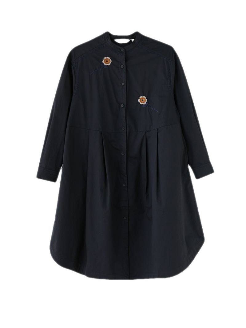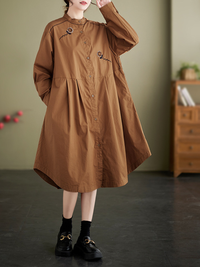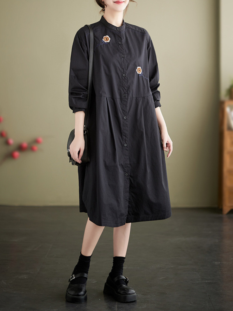Fashionable Embroided Loose Stand-Up Collar Shirt Dress