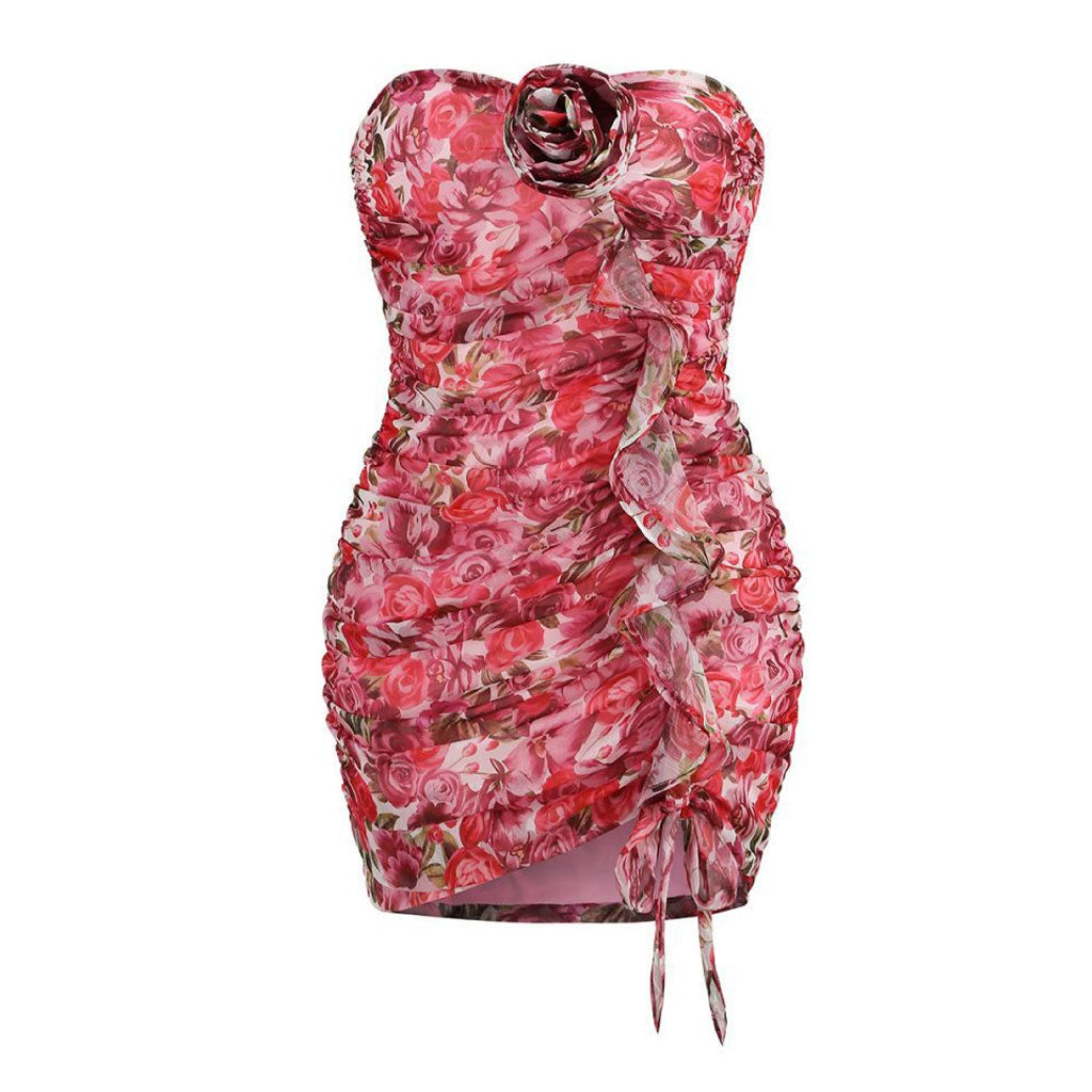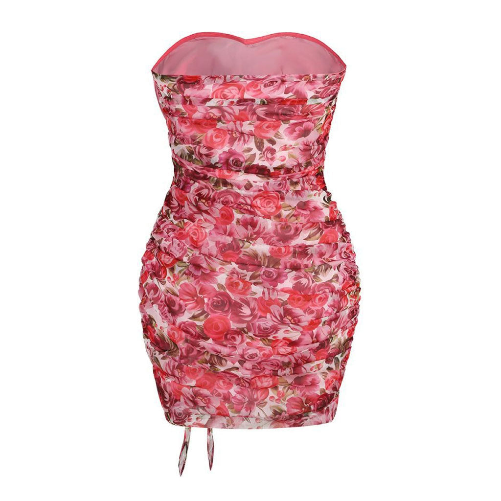 FeMinine Floral Print Rosette Sweetheart Ruffle Trim Ruched Mini Tube Dress