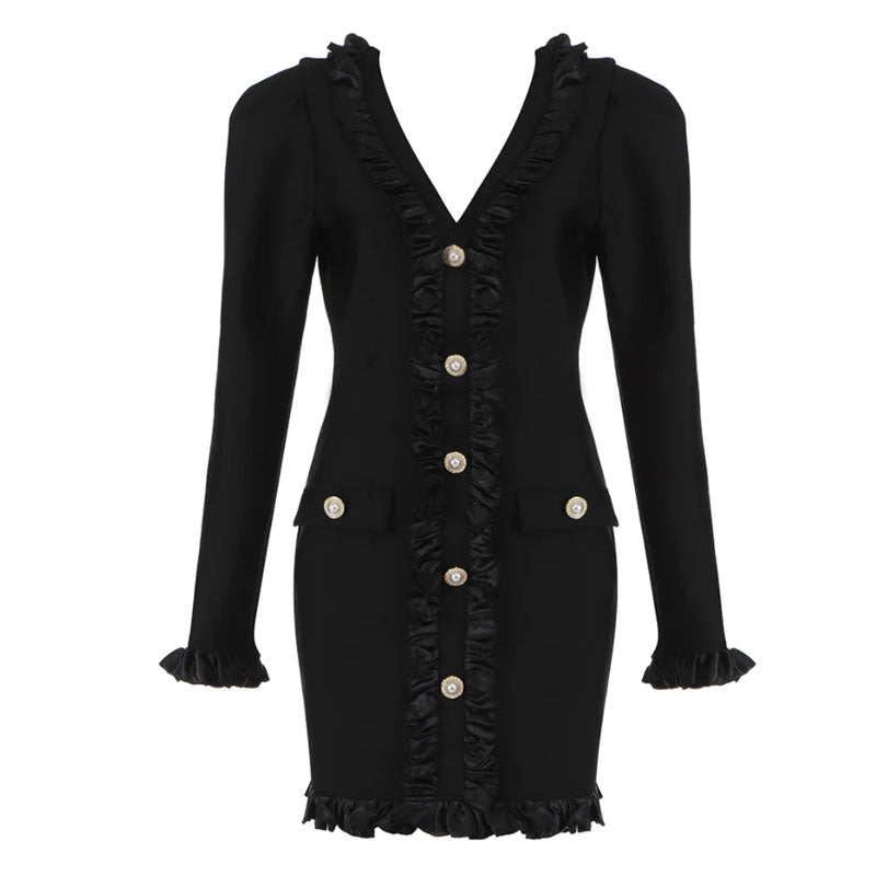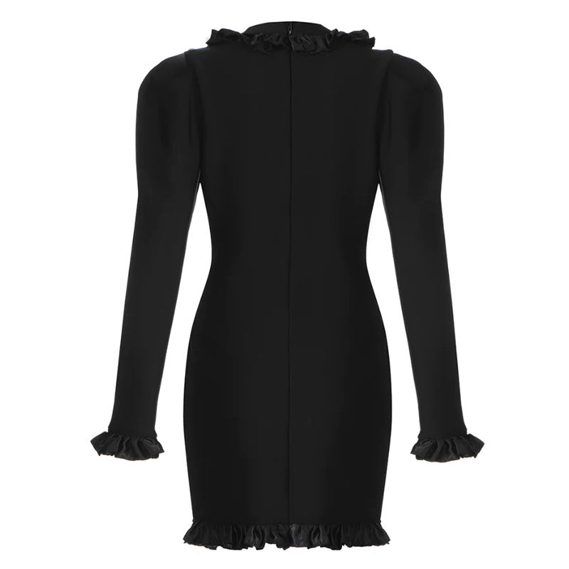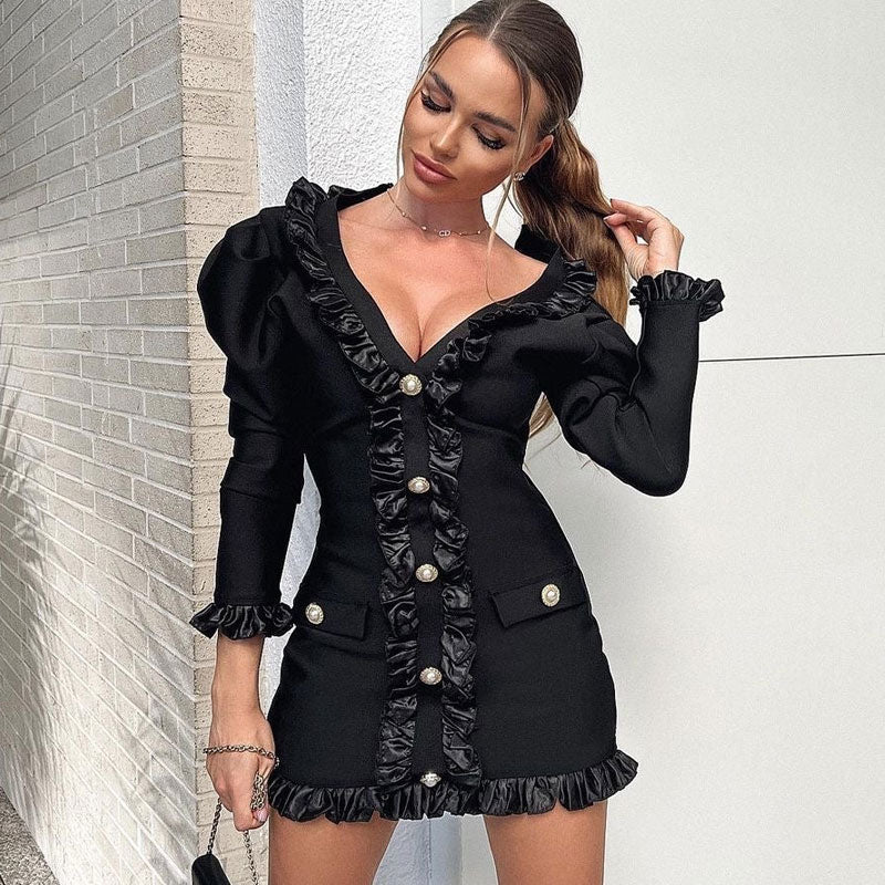FeMinine Ruffle Trim Button Detail V Neck Puff Sleeve Mini Bandage Dress - Black