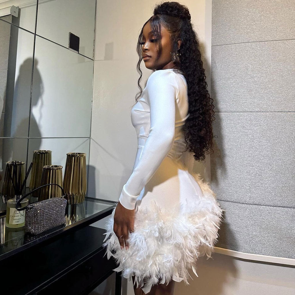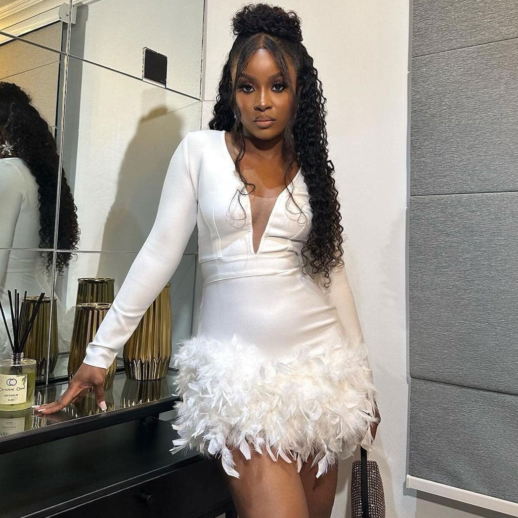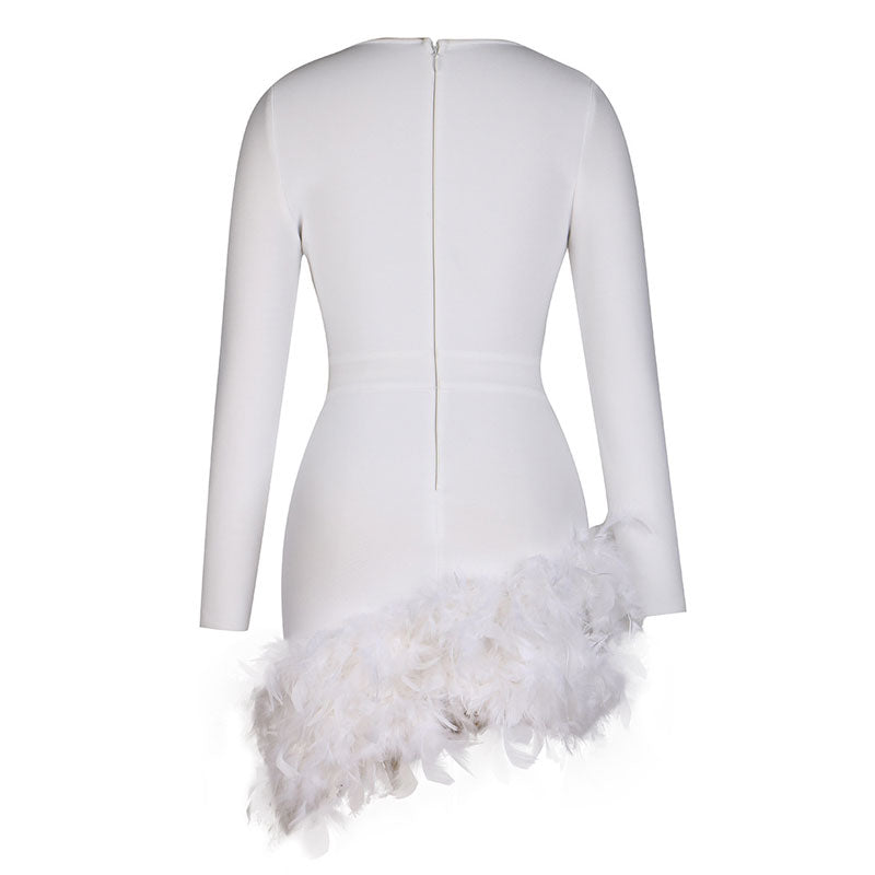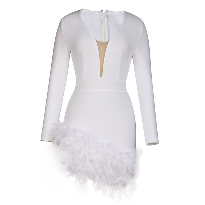 Flirty Faux Feather Trim Plunging Long Sleeve Mini Bandage Dress - White