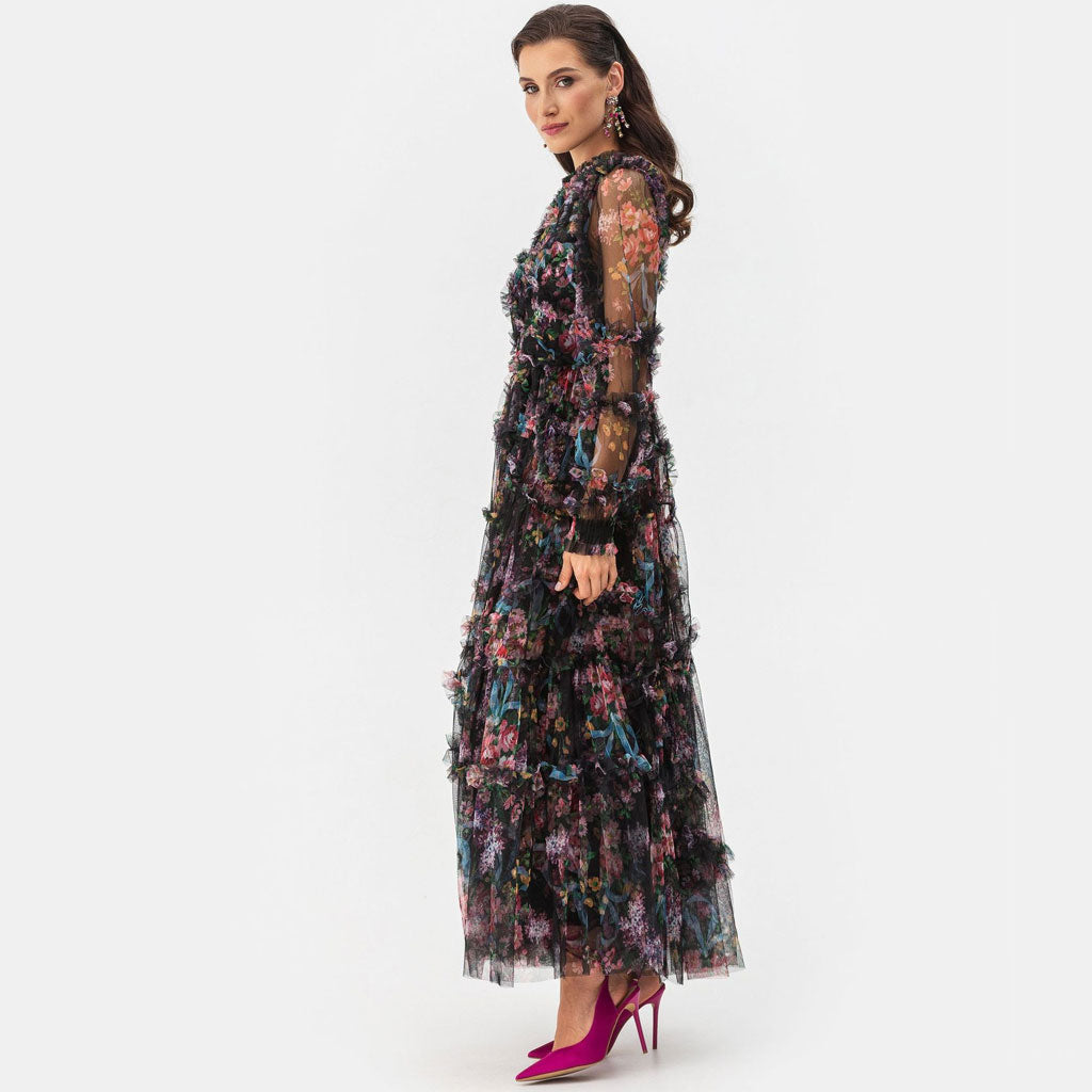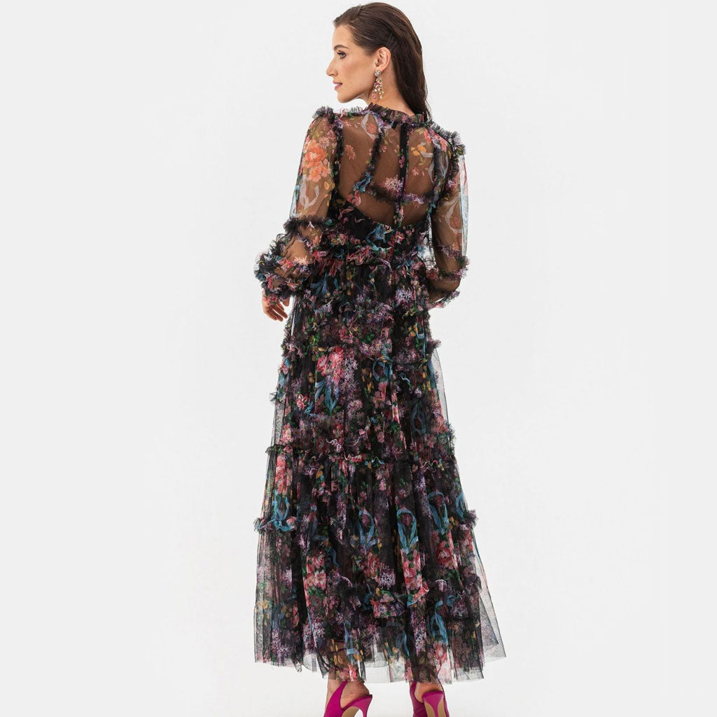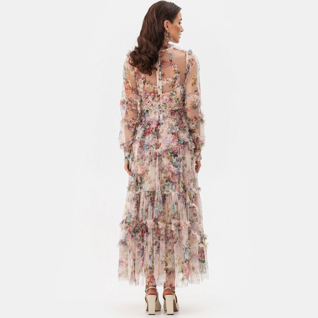 French Style High Neck Bishop Sleeve A Line Ruffle Tiered Floral Tulle Maxi Dress