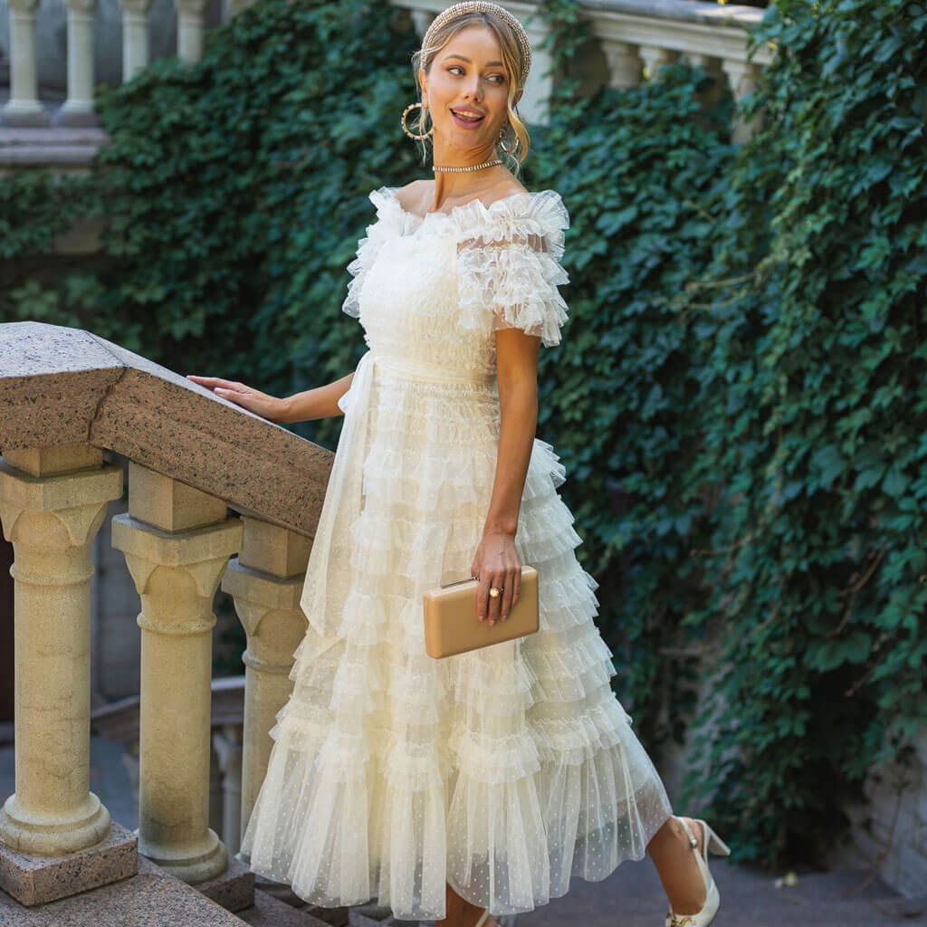 French Style Ruffle Off The Shoulder Short Sleeve Dotted Tulle Tiered Maxi Dress