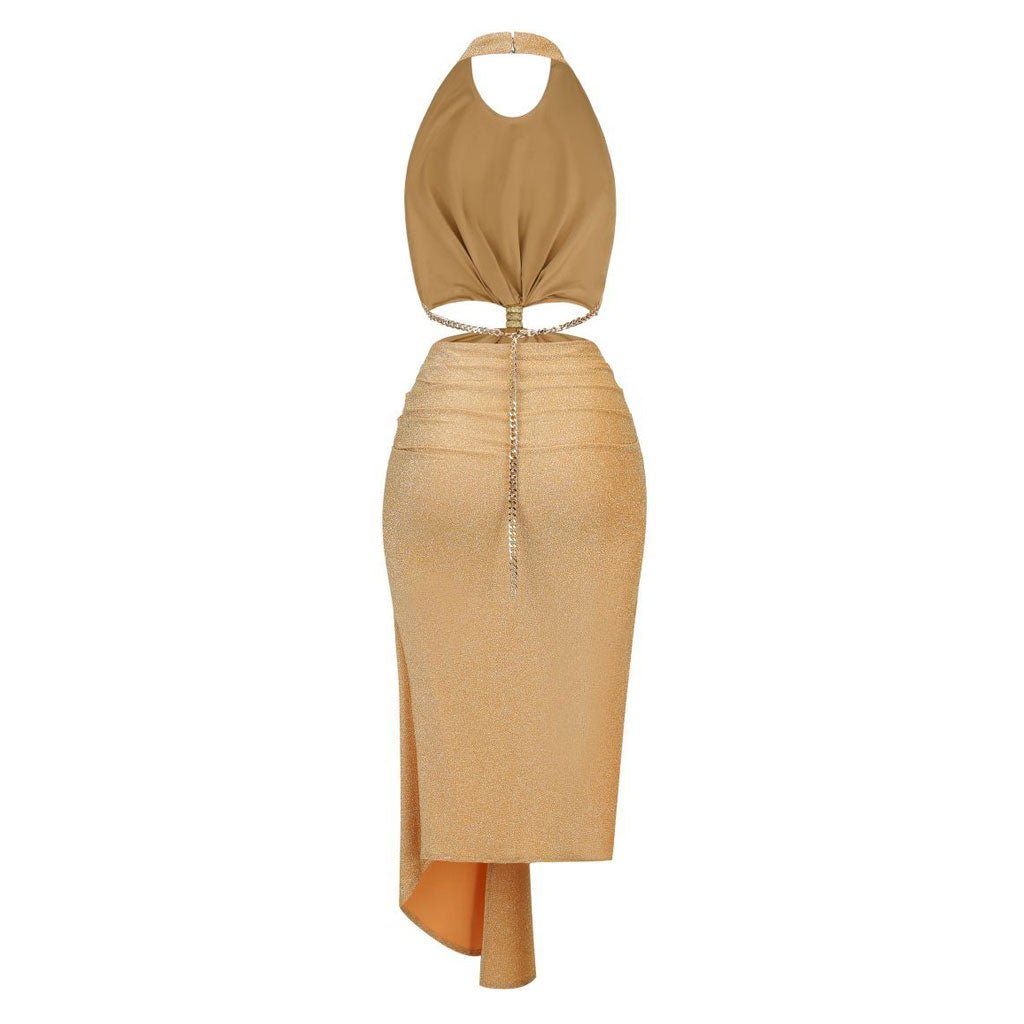Glittering Draped Halter Metallic Chain CutOut Backless Midi Dress - Gold