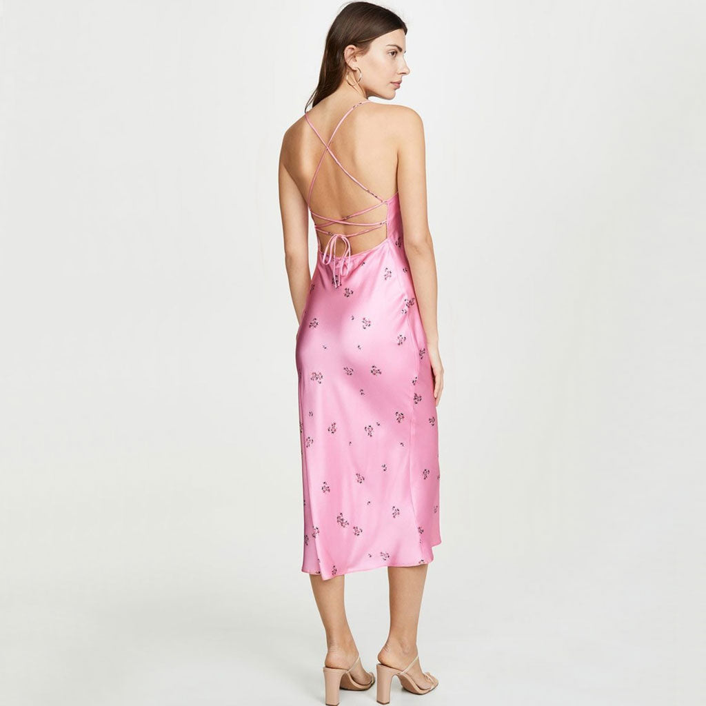 Glossy Ditsy Floral Print Backless Satin Slip Midi Dress - Pink