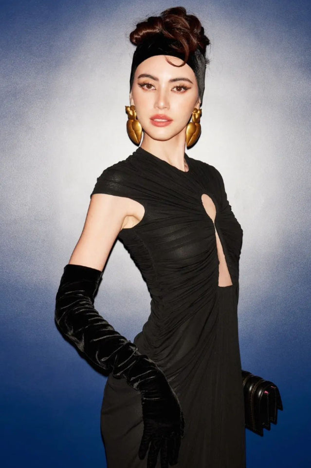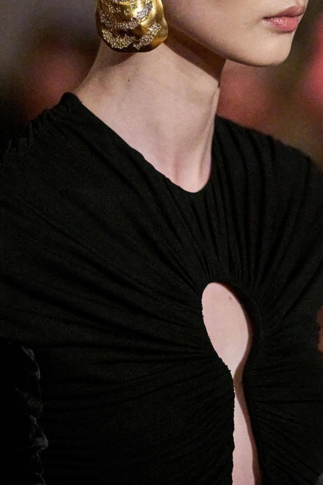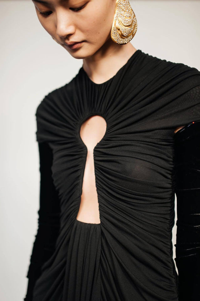 Crew neck, short sleeves, cut out detail, ruffle design, maxi length.