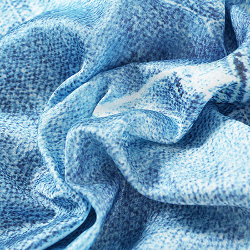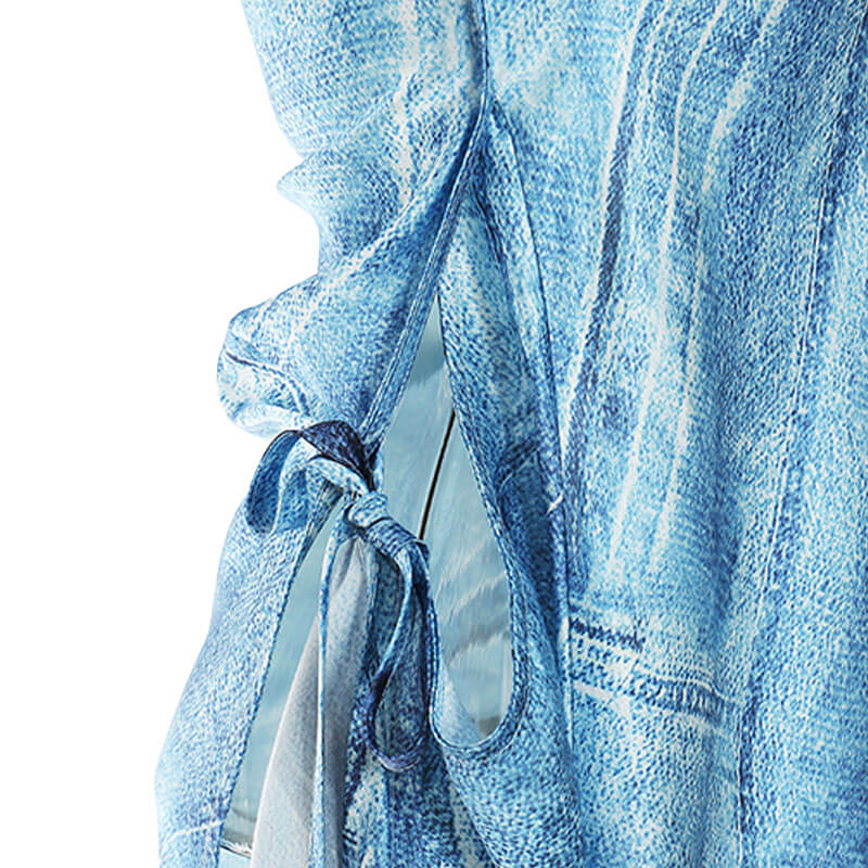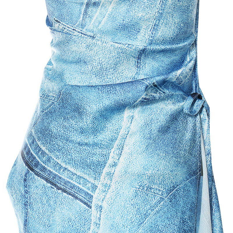Graphic Denim Print Cowl Neck Shoulder Tie Side Wrap Slip Midi Dress