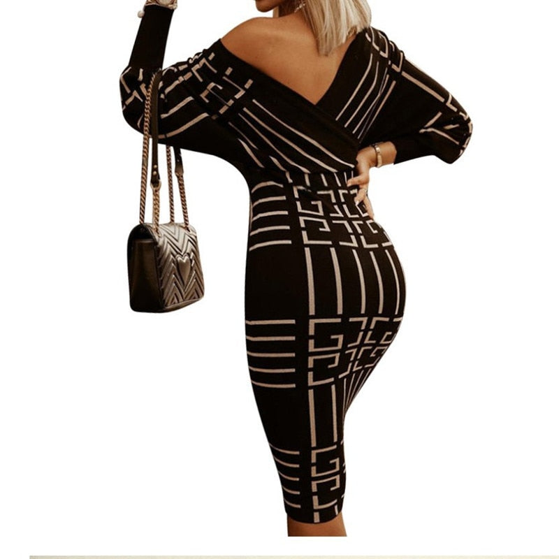 This trendy midi dress is perfect for any occasion. It features a v-neck and lantern sleeve design that is sure to make her look her best. The geometric pattern is a fun and flattering choice that suits a variety of different styles. The stretchy fabric makes it easy to move around in.