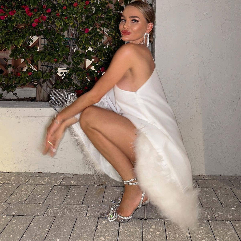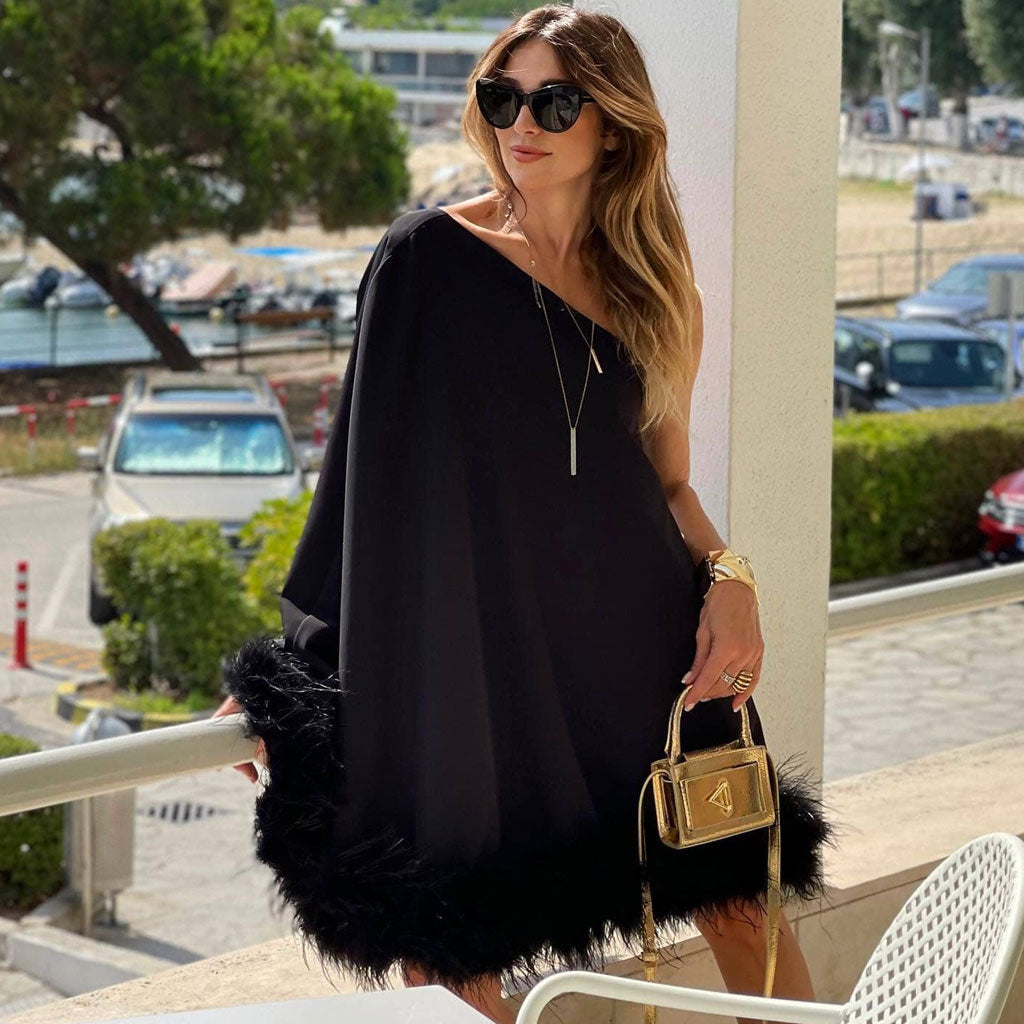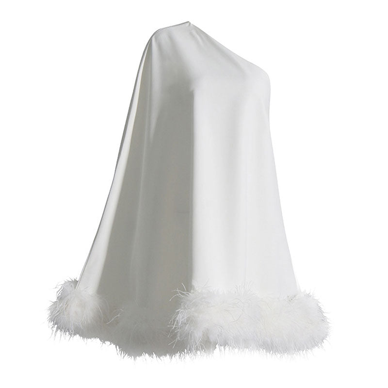 Lavish One Shoulder Cape Style A Line Layered Faux Feather Mini Dress