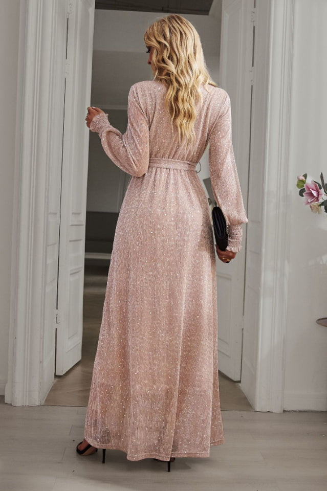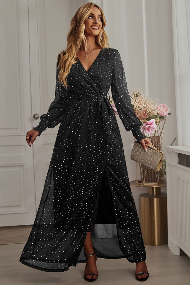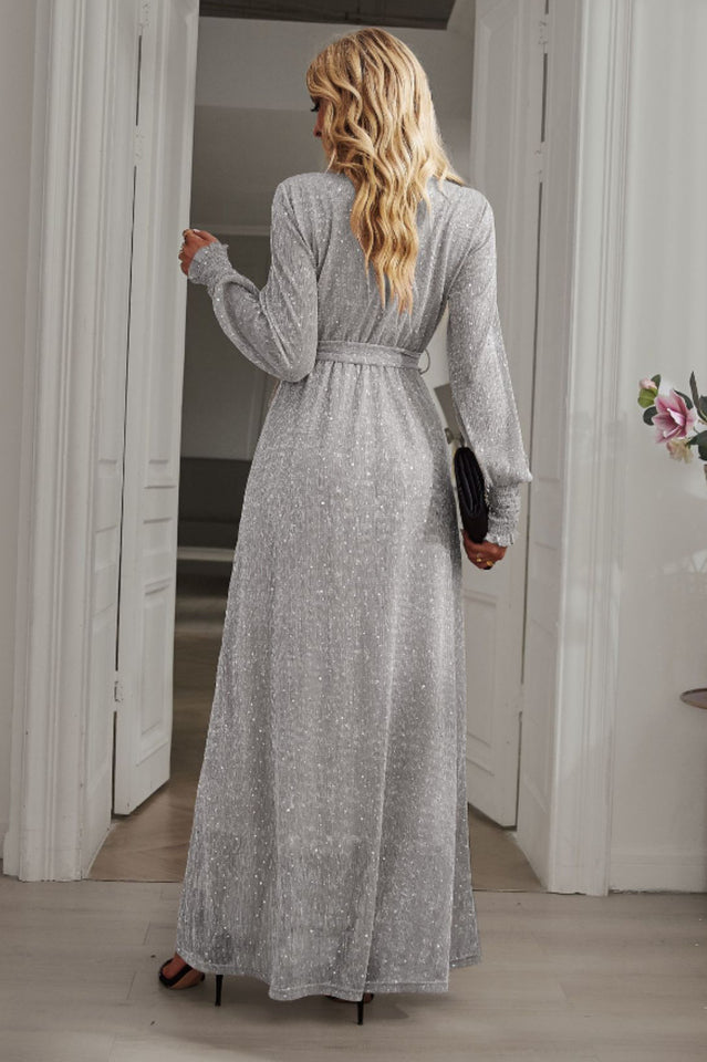 • Feature:Shimmer detail. V-Neckline. Maxi length. Waist Tie. Front slit.
